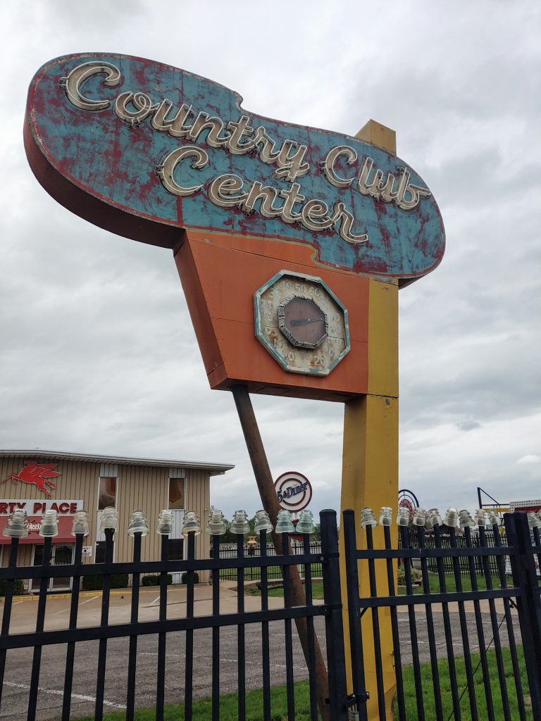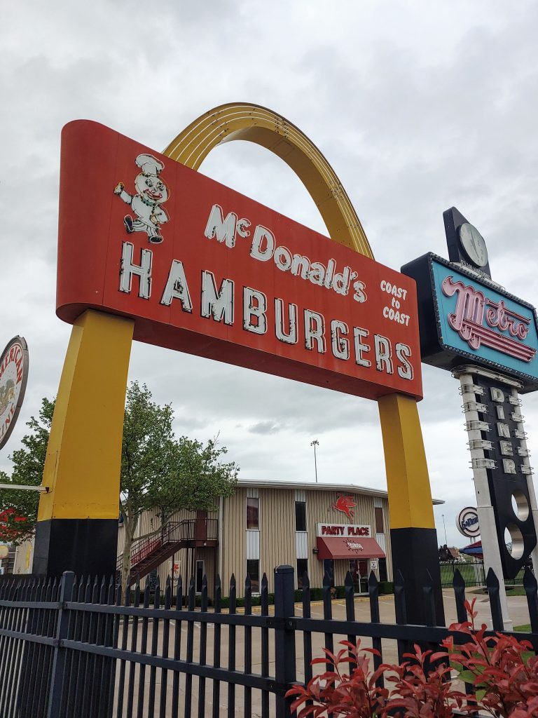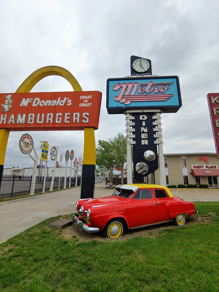 While it took a while working our way through back streets hunting for them, we finally found Stokely’s Party Place, a cool party space surrounded by vintage signs. While we only saw the tops of the larger vintage signs from the freeway, this place also has a ton of vintage gas station signs and even a vintage car on display. Unfortunately, the gate was closed, but we were still able to get a good look at things from the road and take advantage of this retro photo op.