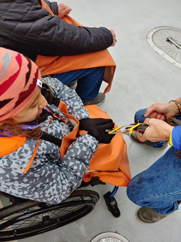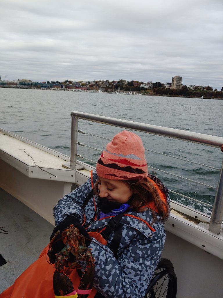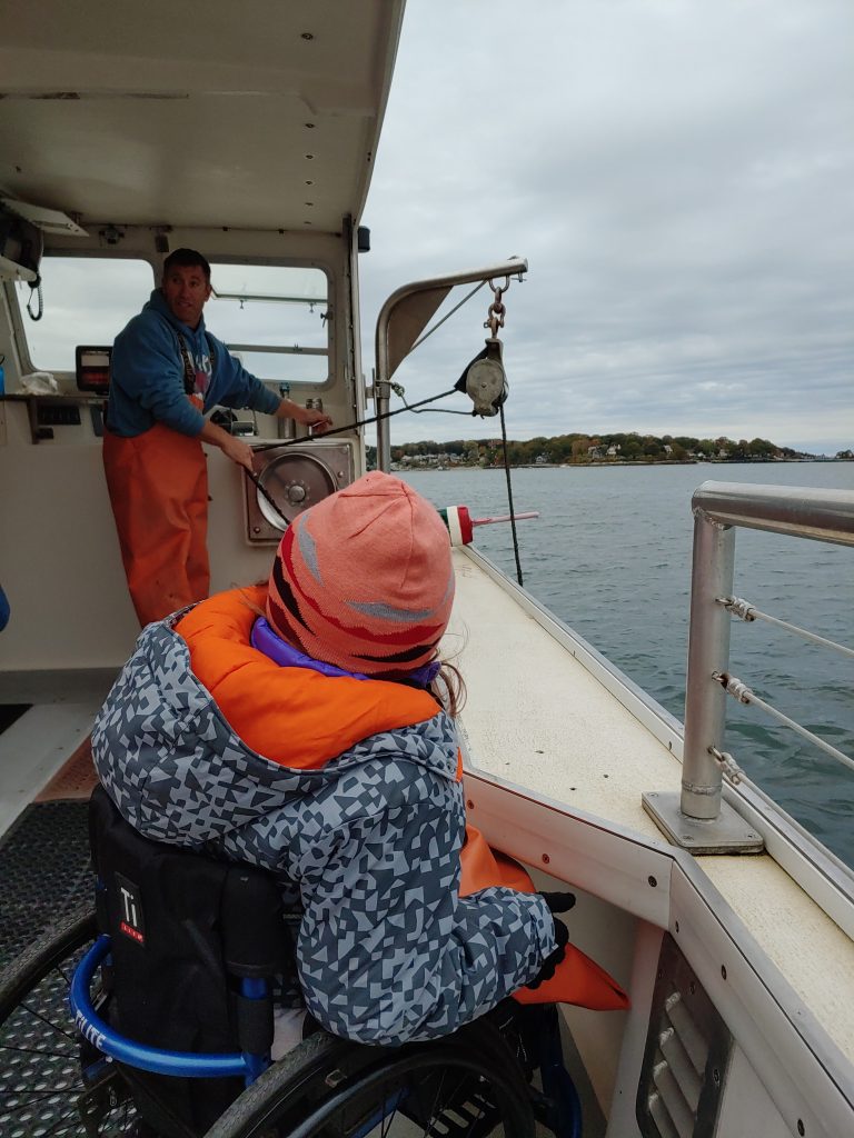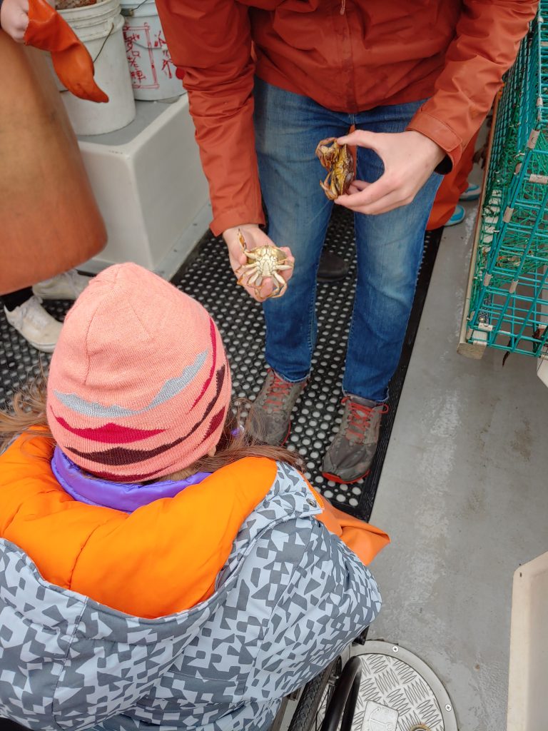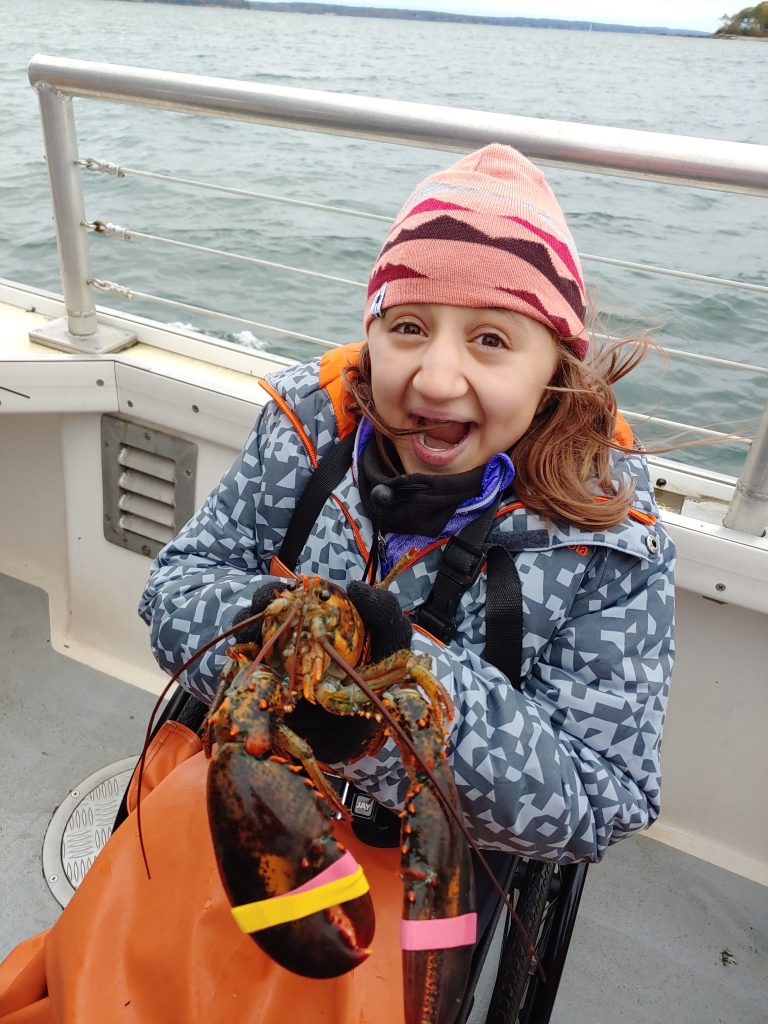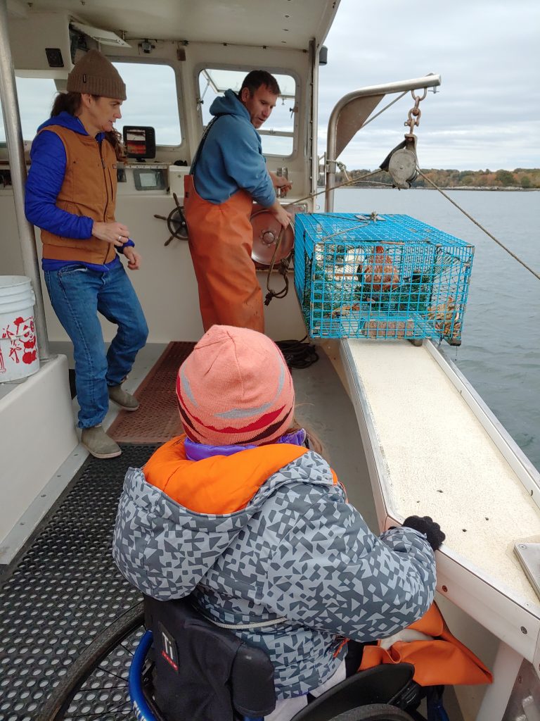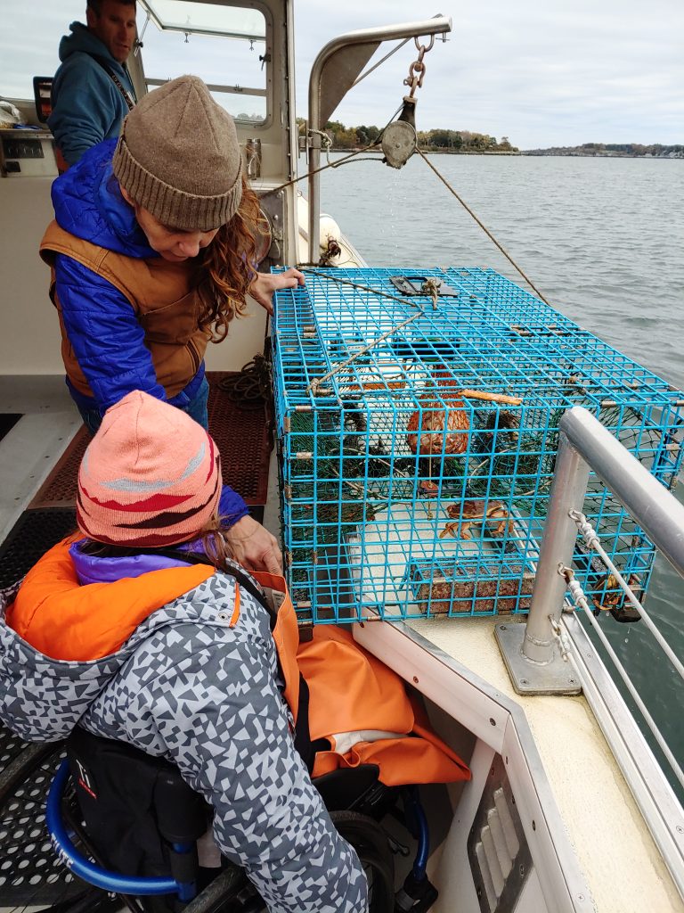 As they pulled them out of the traps, we learned how to measure the lobsters, tell if they are male or female, and how to band their claws so they don’t hurt one another in the holding tank. The hands-on fun continued as we all got to take turns stuffing dead fish into bait bags, and re-bait the traps before pushing them off into the water. This process repeated several times as we traveled around checking all of the traps. Along the way, we also got to see and toss back several types of crabs. One of them even snuck out of the bottom of the trap and hid under my wheelchair for a while before the crew could get him scooped up.