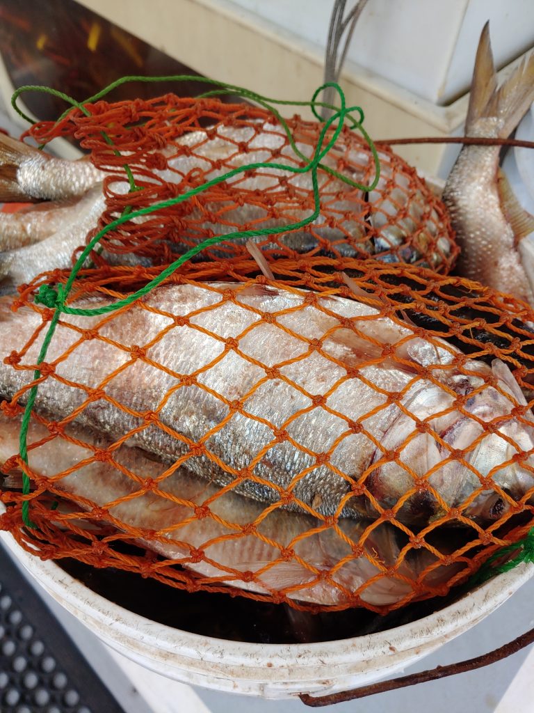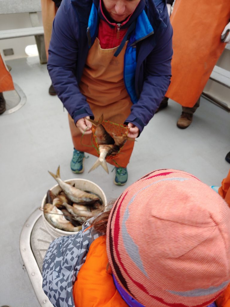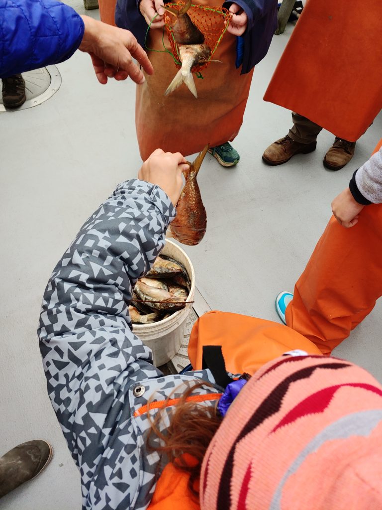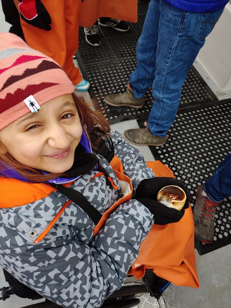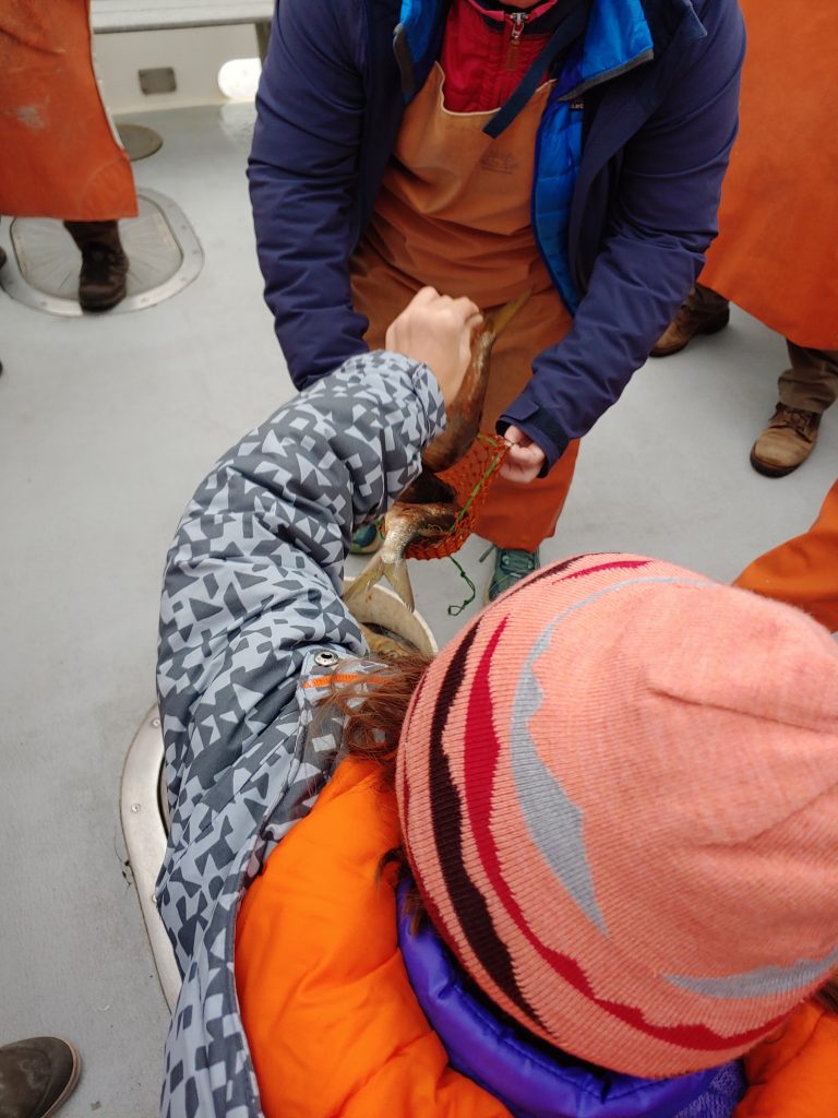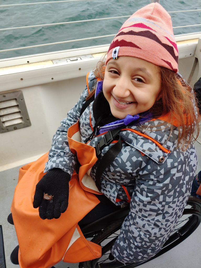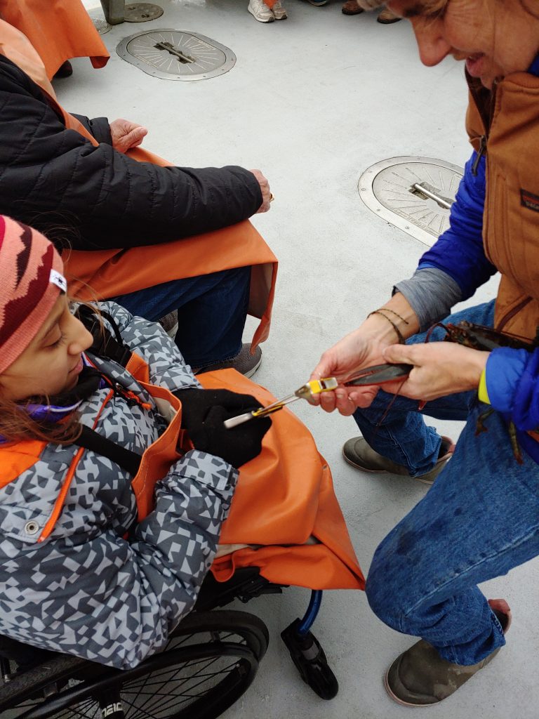 As they pulled them out of the traps, we learned how to measure the lobsters, tell if they are male or female, and how to band their claws so they don’t hurt one another in the holding tank. The hands-on fun continued as we all got to take turns stuffing dead fish into bait bags, and re-bait the traps before pushing them off into the water. This process repeated several times as we traveled around checking all of the traps. Along the way, we also got to see and toss back several types of crabs. One of them even snuck out of the bottom of the trap and hid under my wheelchair for a while before the crew could get him scooped up.