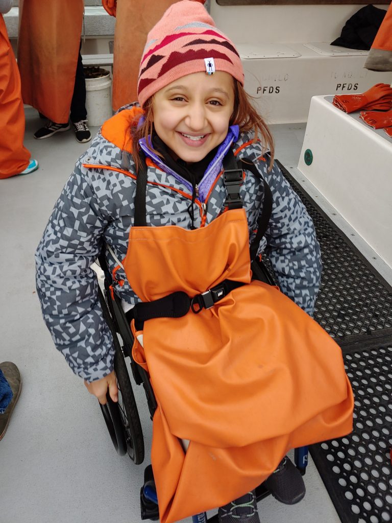 Once I was on the lower dock, I transferred from my chair to the edge of the boat. This was wide and flat, and it felt sturdy as I turned and swung my legs over to the other side. The Lucky Catch team then lifted my chair onto the boat for me, and I transferred again. For the rest of the adventure, I was able to stay in my chair and roll around the boat as I wanted! There is seating along the sides and back of the boat for anyone who needs to sit during the trip.