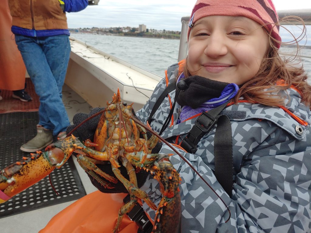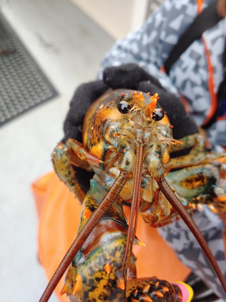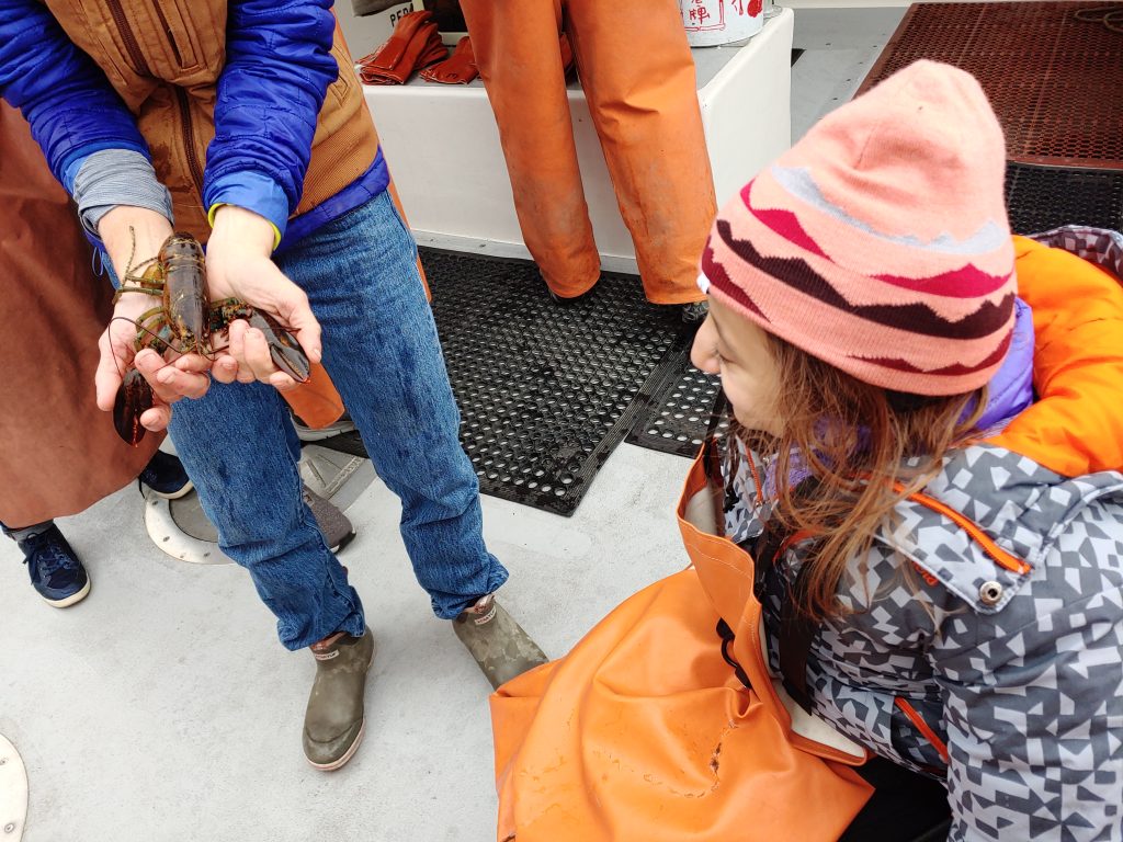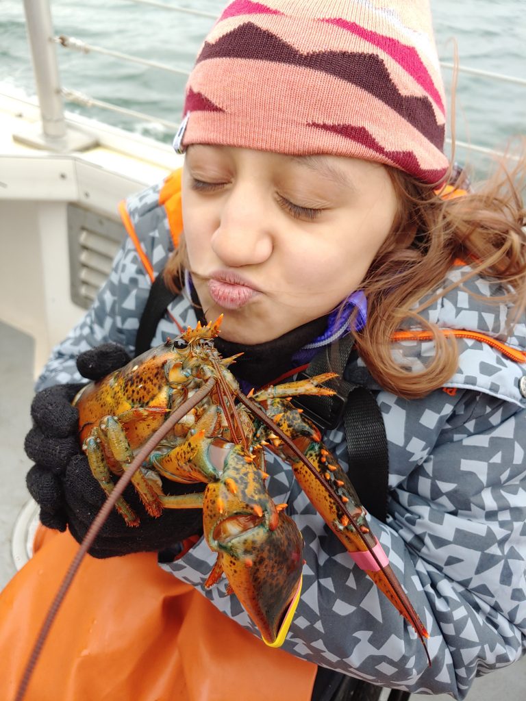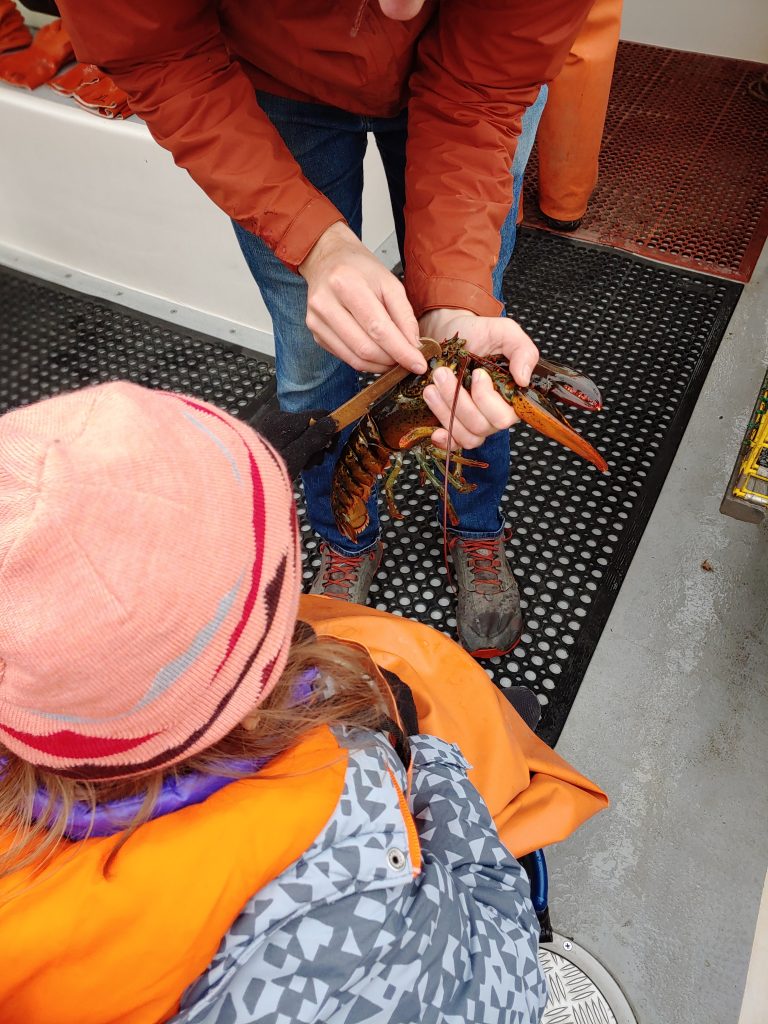 If a female lobster is caught with eggs, which look like tons of black dots on their belly, the lobstering crew will cut a notch into the left side of their “tail fan” before setting her free back in the water. Every female lobster that is caught has their tail checked before they are kept, making sure they haven’t been marked in the past. This means that the breeding females are protected for life, allowing them to keep having babies and maintain the lobster population!