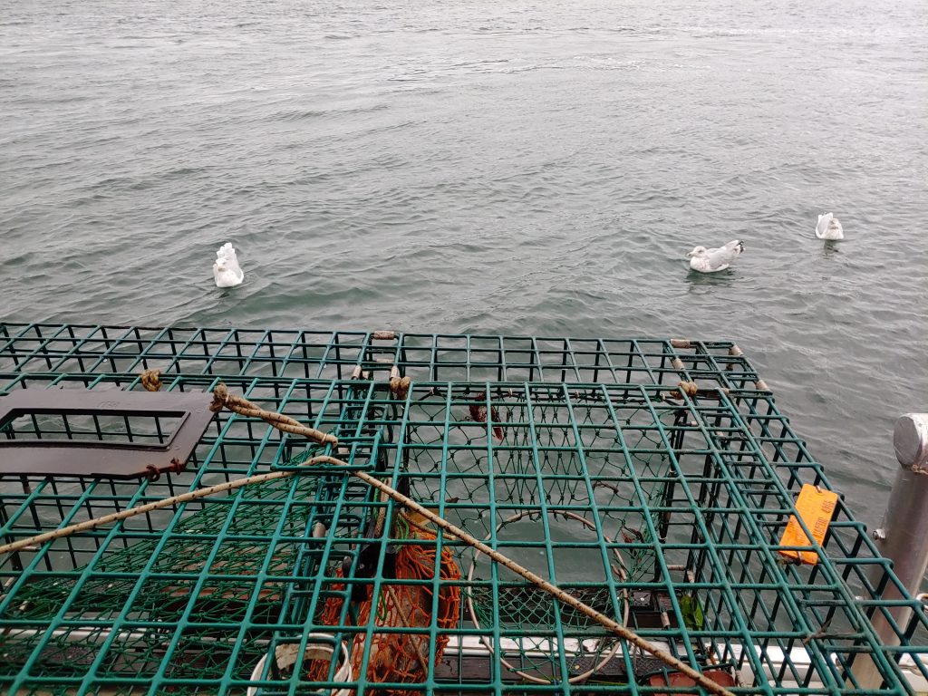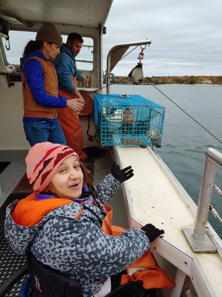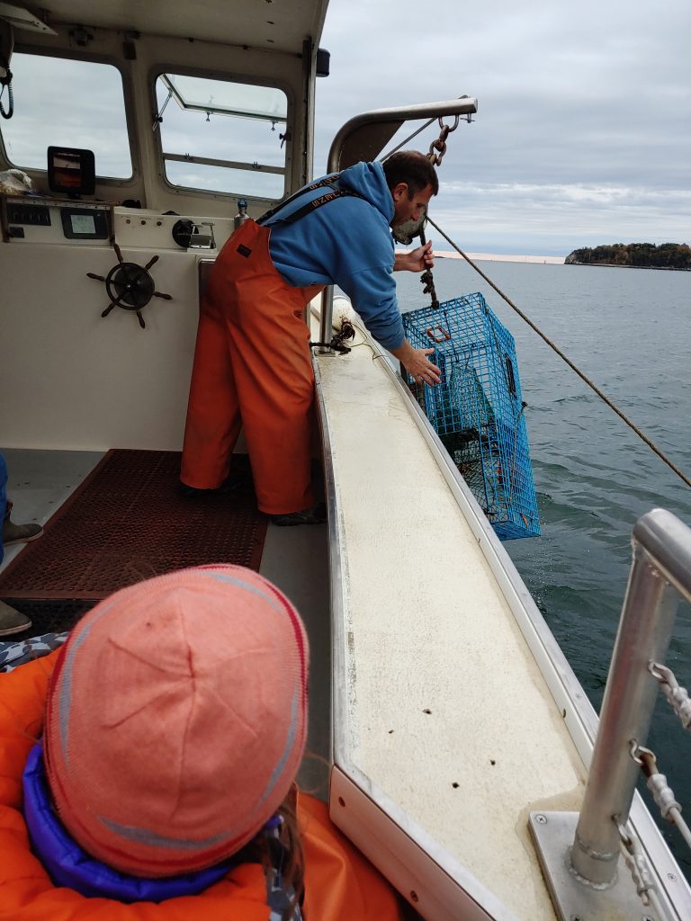 They explained that each lobsterman has different colors and patterns they paint their buoys, so they can easily find them again in the water. When we arrived at the first traps to “pull” out of the water, I loved watching them use a long hook to grab the buoy, and then how easily a large crank at the front of the boat pulled the heavy traps out of the water.