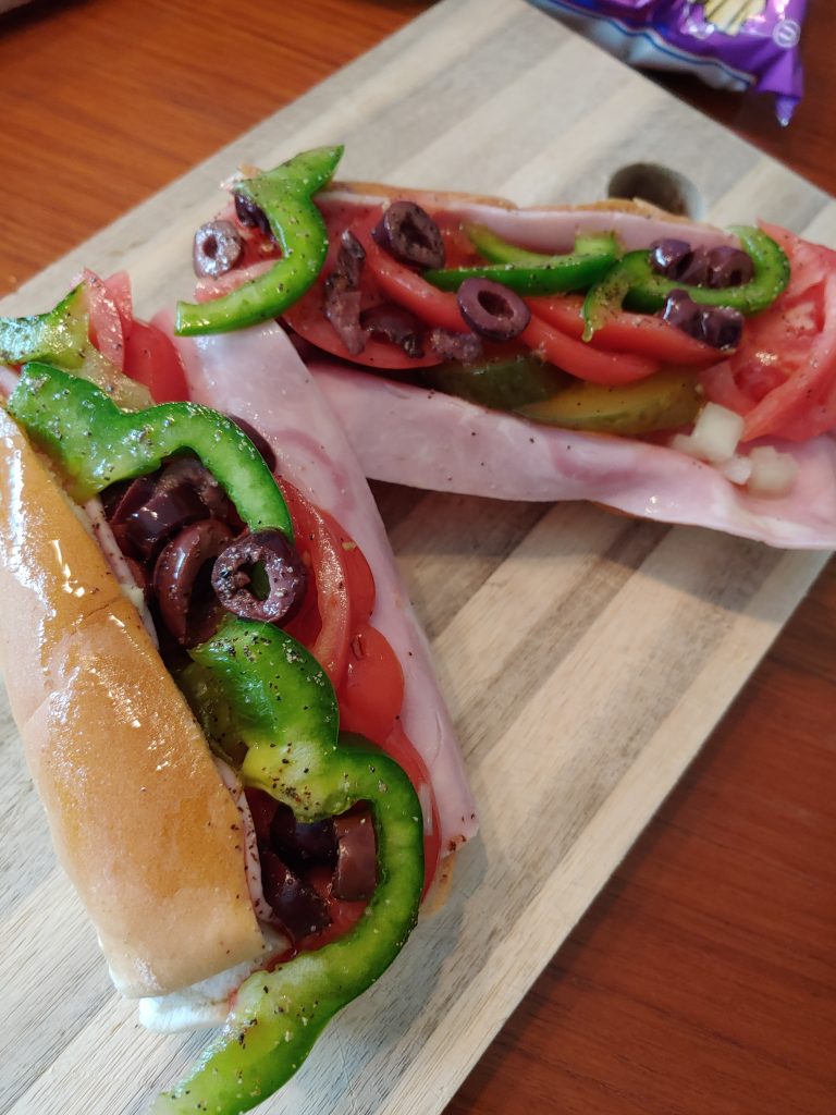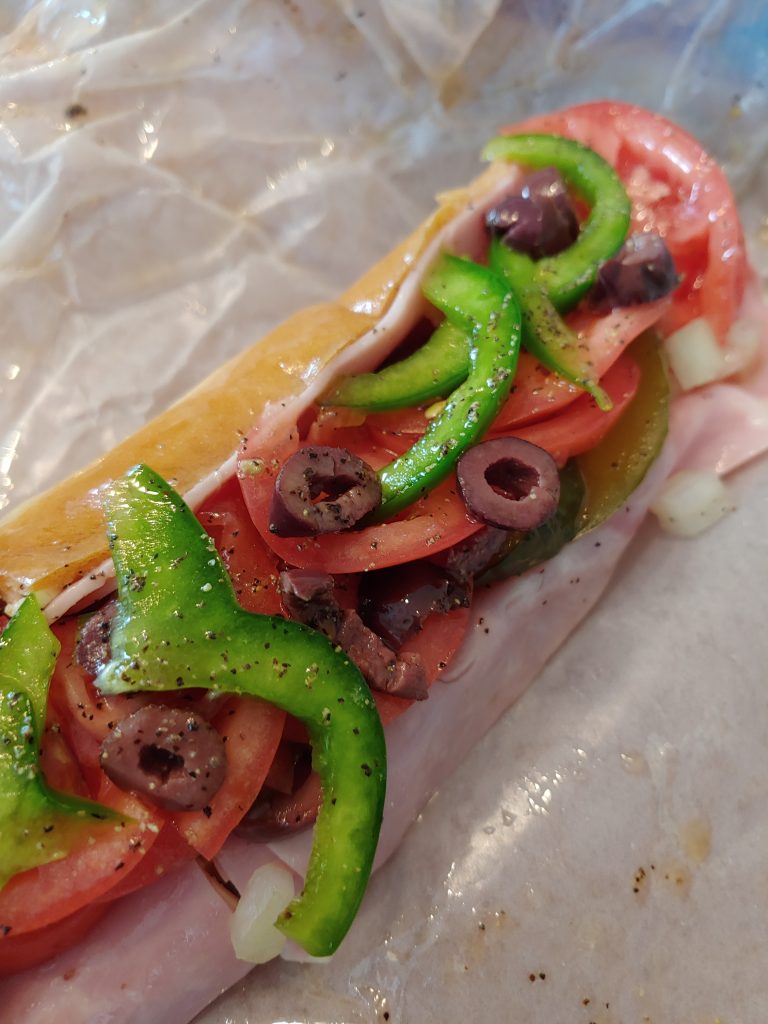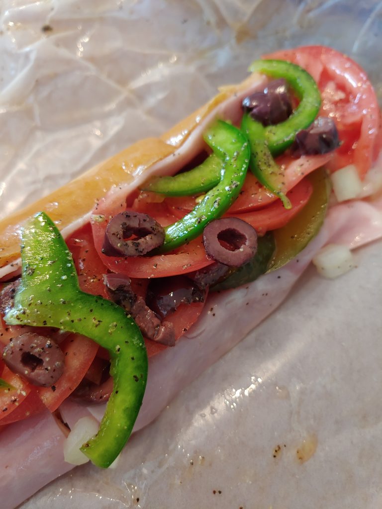 Our first time there, we went for their classic sandwich. The Amato’s Original Real Italian sandwich is sliced ham, sliced american cheese, onions, pickles, tomatoes, green pepper rings, olives, salt, pepper, and oil. The ham reminds us of the style you would find packaged in grocery stores called Danish ham slices or boiled ham in thin rectangle slices. We grabbed a bag of local chips there too.