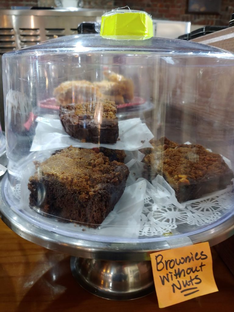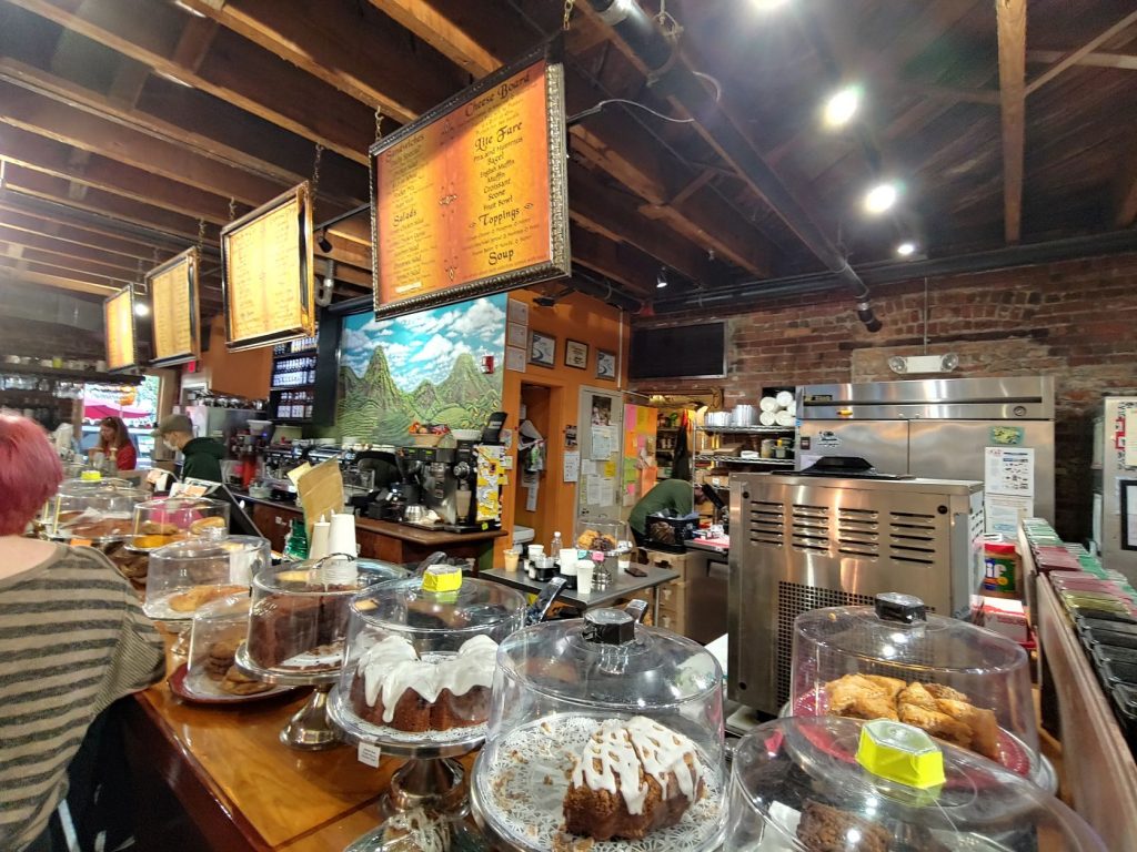 The space is fully accessible, with a ramp inside leading to the counter to place your order. It’s a small space, full of cozy seating areas and art for sale. Some of the spaces were a little snug to navigate in my chair, but we made it work. They also have a couple of tables outside if you want to enjoy the view of the park across the street. Great start to our day.
