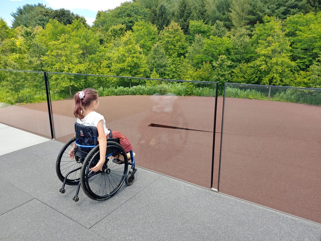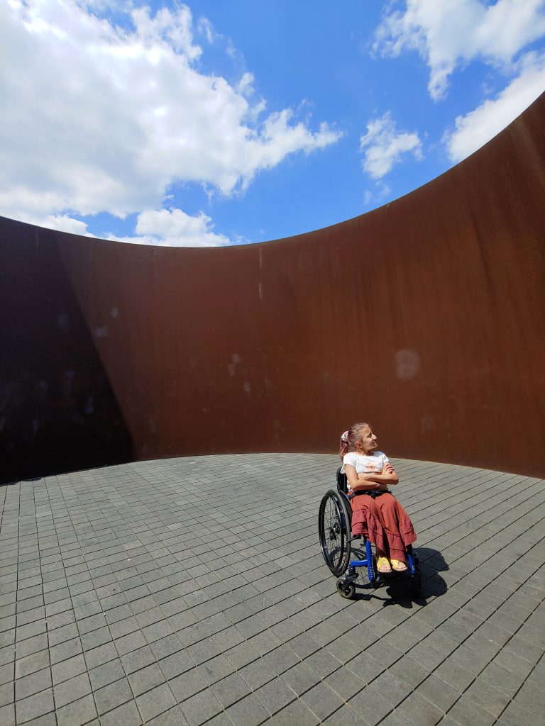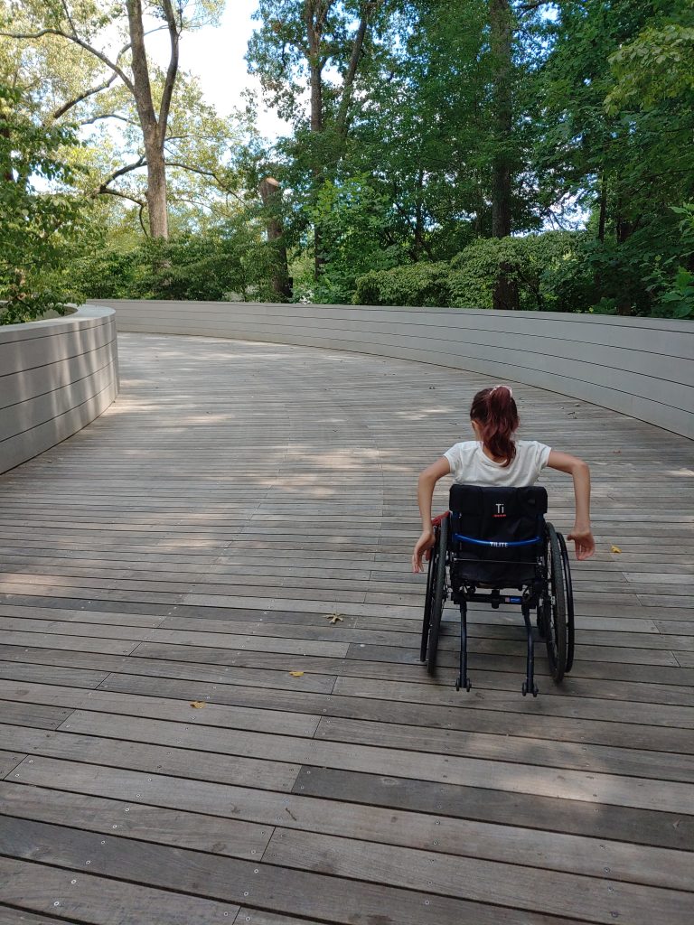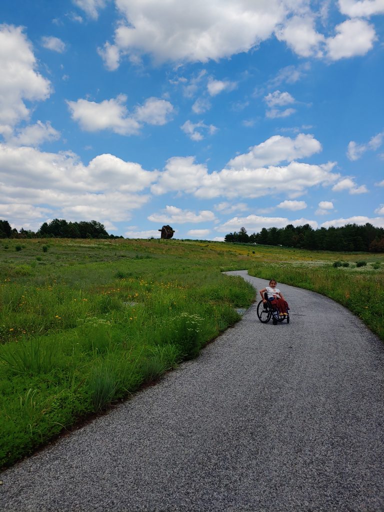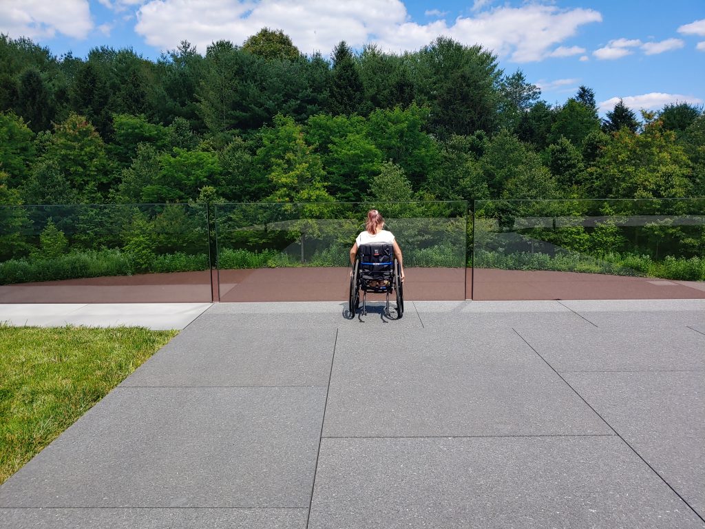 Outdoor pathways always make us a little nervous until we have visited in person. Often people don’t realize how difficult certain terrain can be in a wheelchair. However, the primary pathway connecting the exhibits at Glenstone is all smooth and wide, accommodating multiple groups and those with mobility needs easily. There is a gradual hill that runs nearly the full length of the walk, but it’s not too steep to navigate in a self-propelled chair and not only are there benches along the way to stop and rest if needed, but there are also tons of stunning flowers to pause and look at.