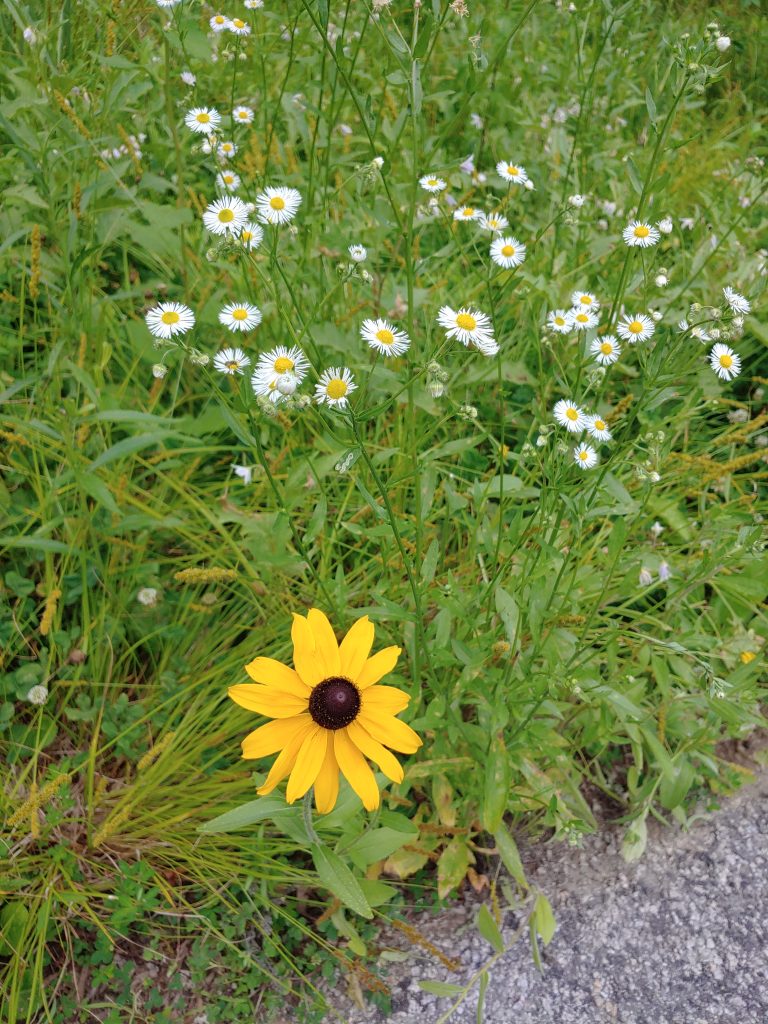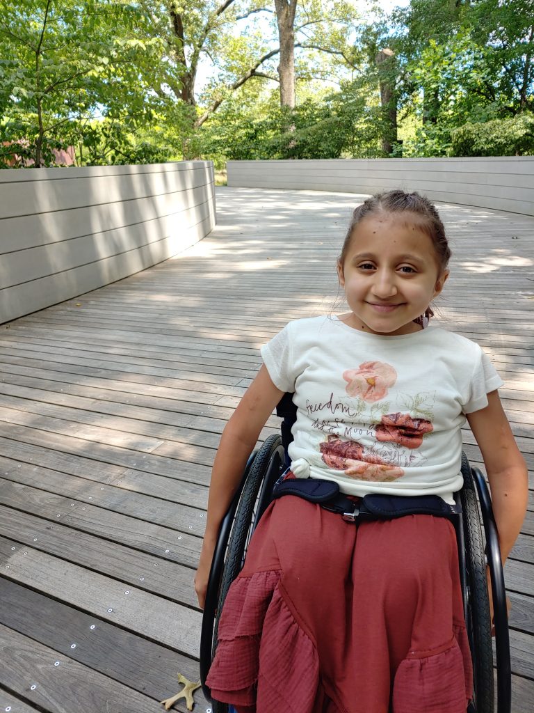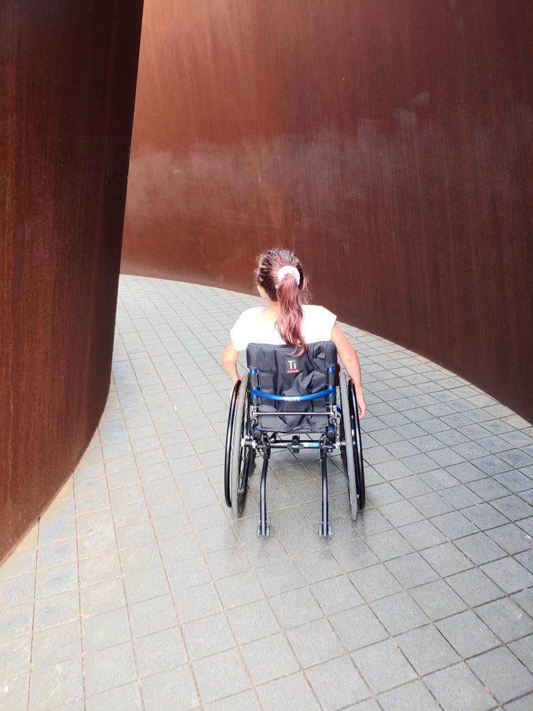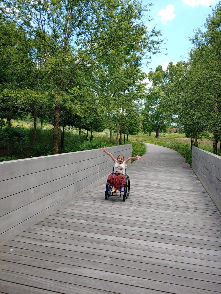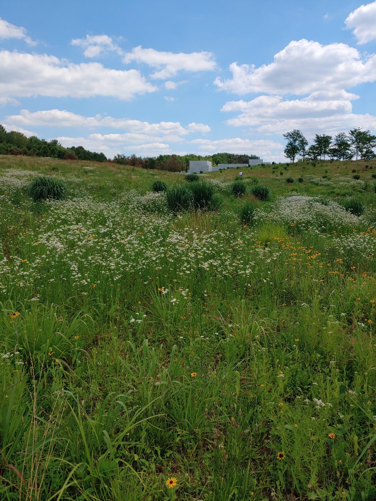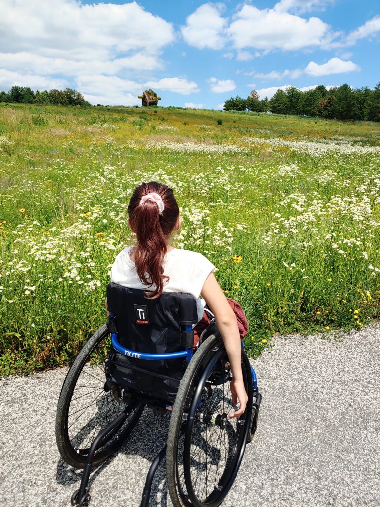Outdoor pathways always make us a little nervous until we have visited in person. Often people don’t realize how difficult certain terrain can be in a wheelchair. However, the primary pathway connecting the exhibits at Glenstone is all smooth and wide, accommodating multiple groups and those with mobility needs easily. There is a gradual hill that runs nearly the full length of the walk, but it’s not too steep to navigate in a self-propelled chair and not only are there benches along the way to stop and rest if needed, but there are also tons of stunning flowers to pause and look at.