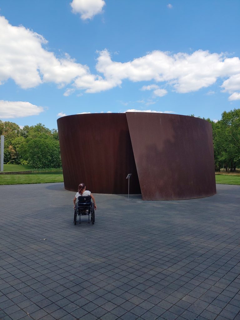 Before entering the gallery, featuring the special exhibit by Faith Ringgold which brought us to the Glenstone that day, we encountered one final outdoor sculpture. A giant piece that you can explore inside and out. I loved taking pictures of this one. The passageway narrows a bit, but I could still reach my arms wall to wall, so I think an average adult-size wheelchair would be able to fit without problems.