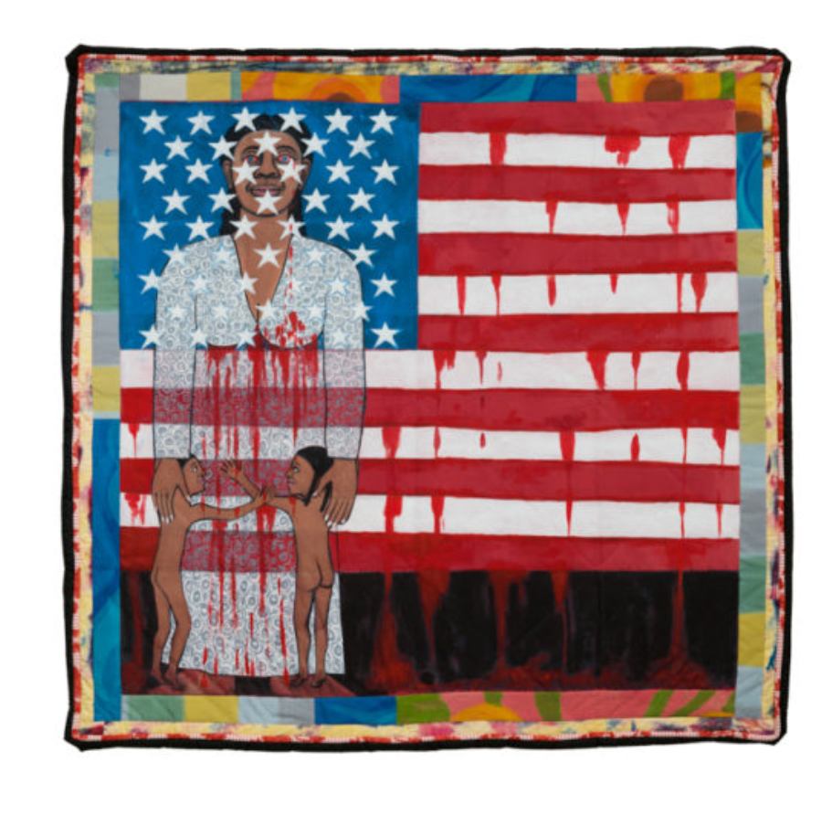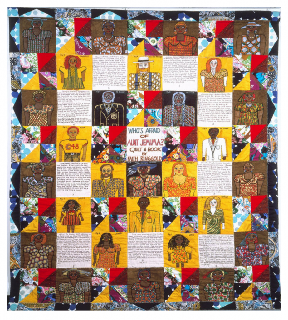 Ringgold was frustrated by needing to ask men for help to move her large-scale paitings, so she found inspiration in Southeast Asian tapestries and began creating textile pieces that could be easily rolled for transport.