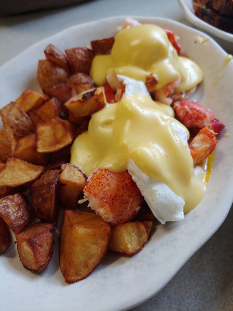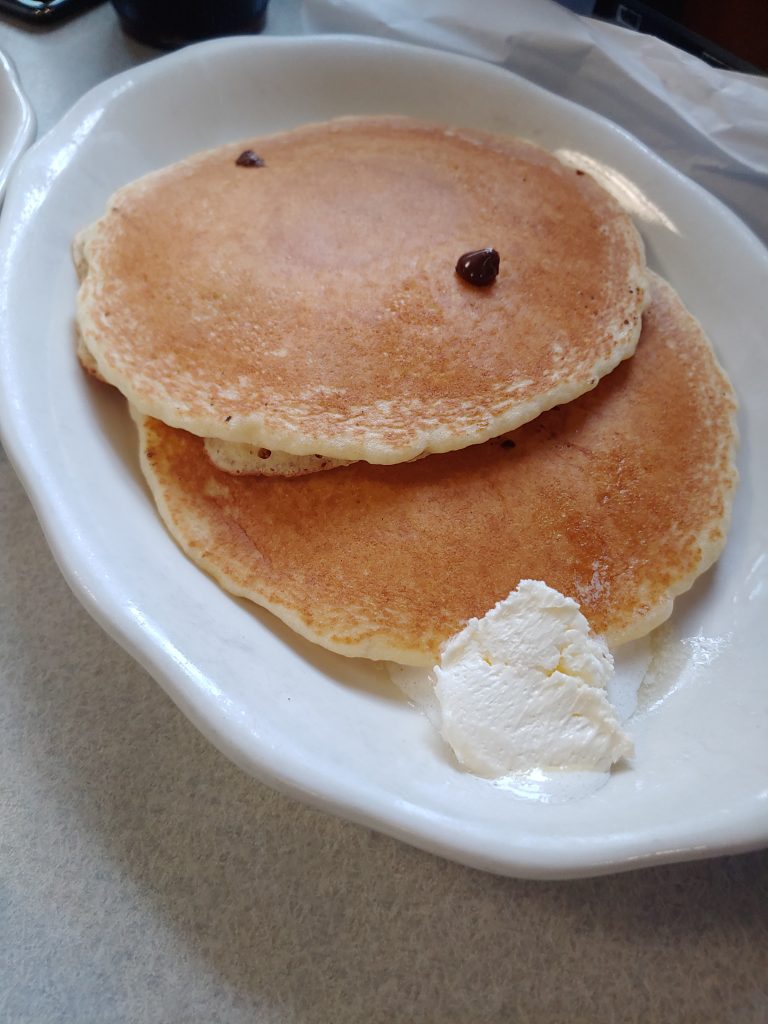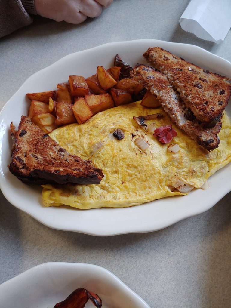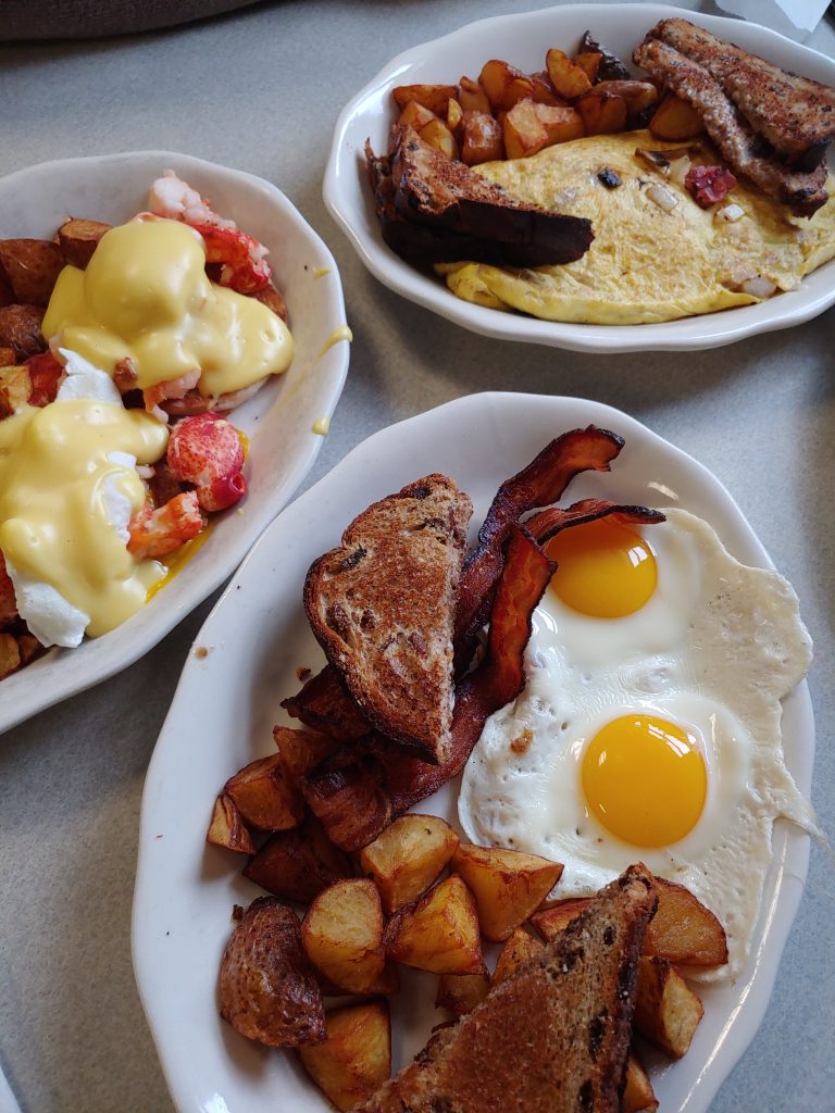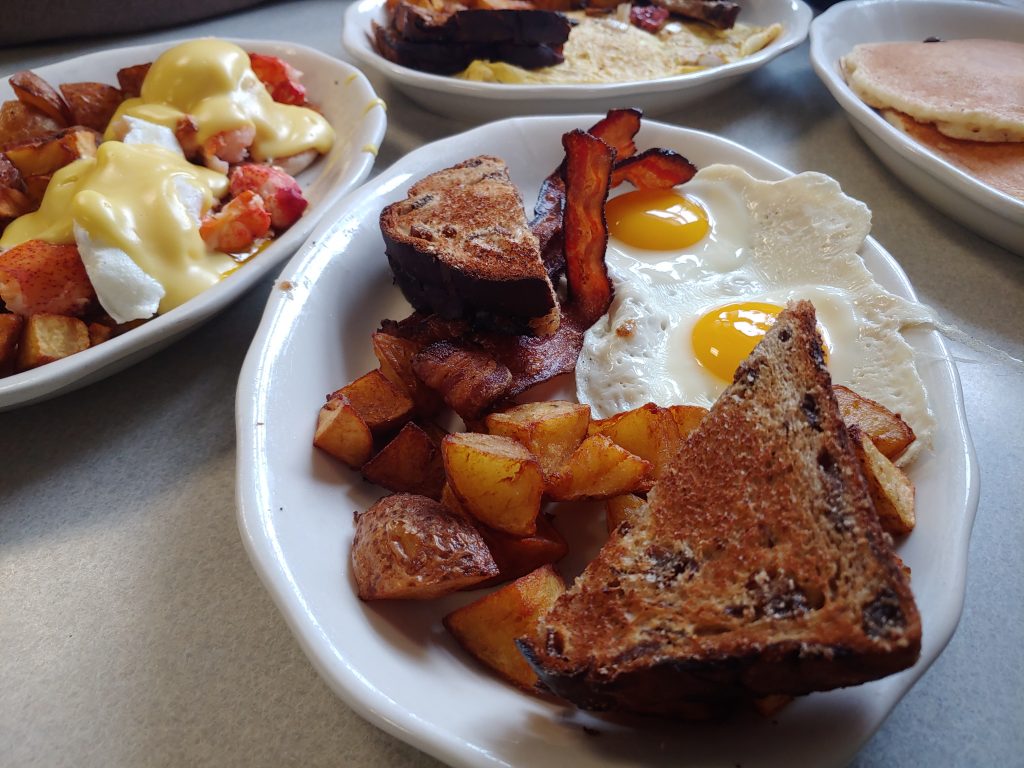 But enough about that, how is the food and service? They earn high marks for each. We had a lobster benedict plate; a huge combination plate with bacon, sausage, eggs, toast, potatoes, AND chocolate chip pancakes; and a pastrami omelet stuffed full of black pastrami, onions, mushrooms, and melty swiss cheese. Everything was perfect. The service was fast and yet warm and friendly in a diner sort of way. Picture your server arriving with multiple mugs of coffee in their hands, spoons dunked in each one. Yep, that kind of a welcoming place.