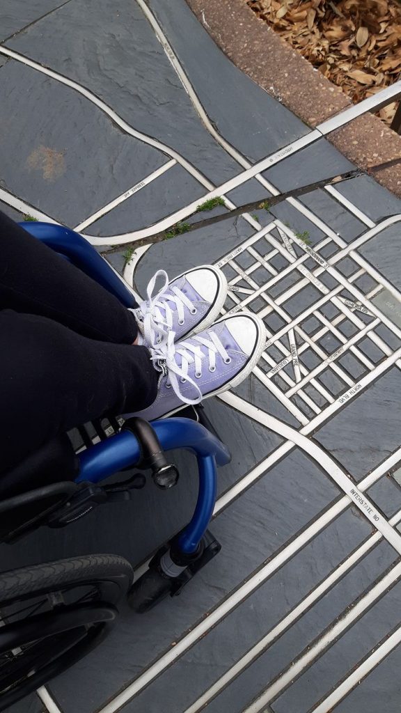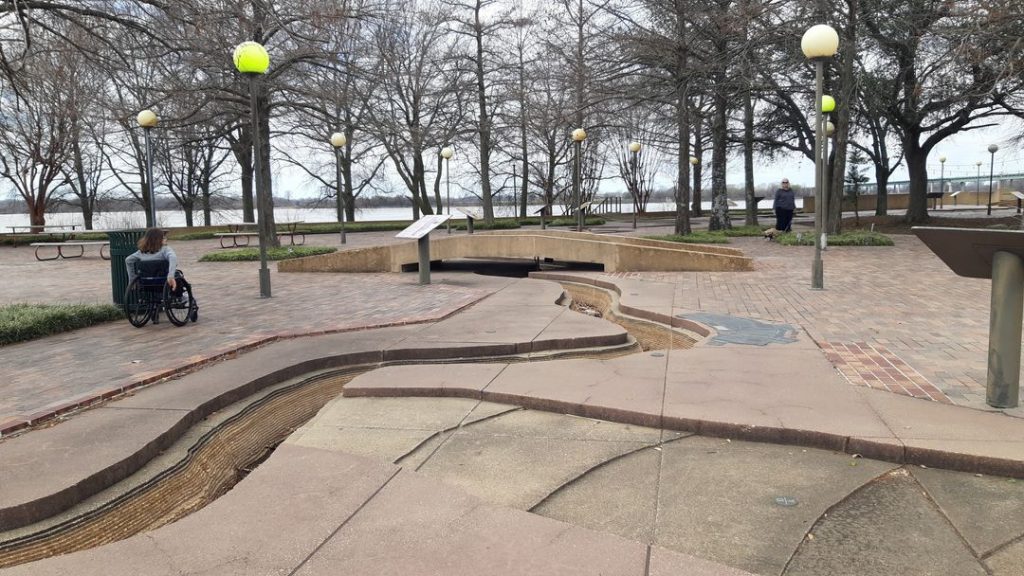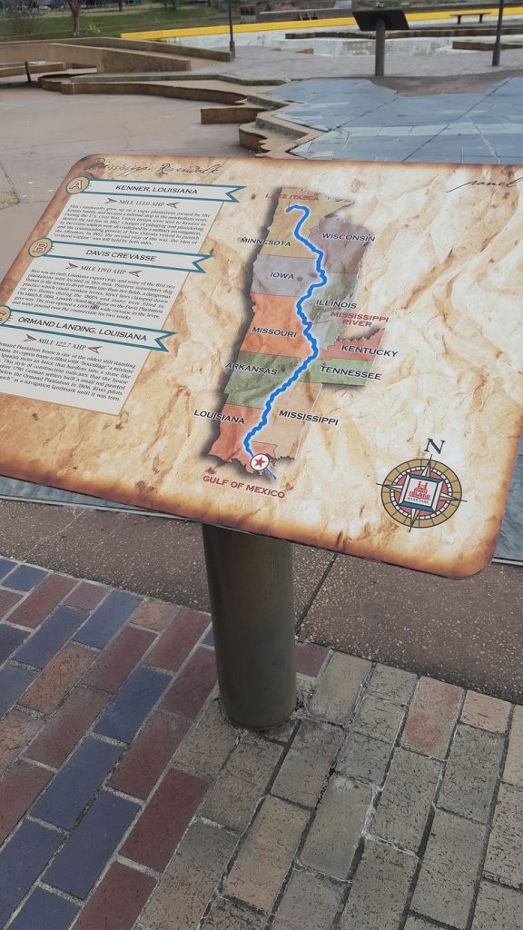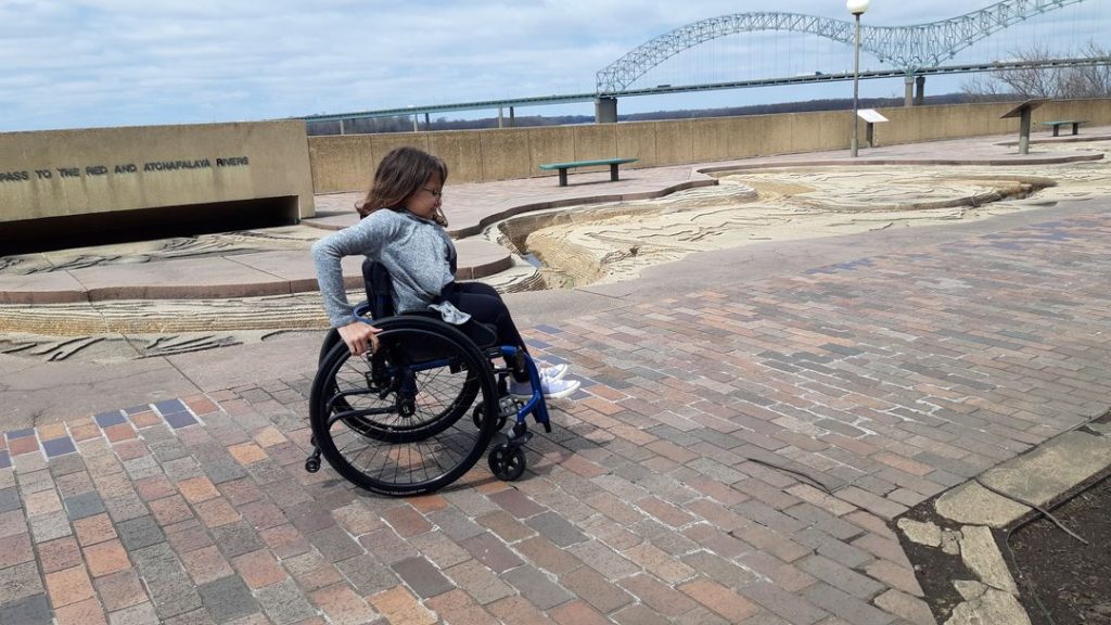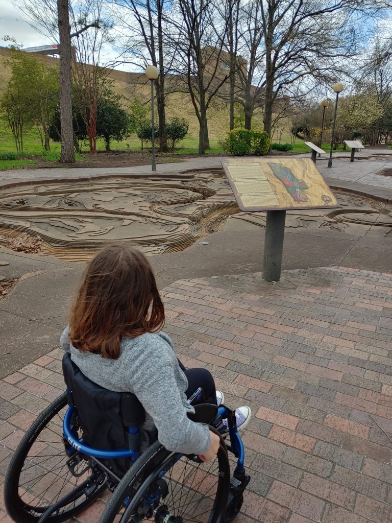 On our way, we stopped in Memphis to check out the Mud Island Riverwalk! The Riverwalk is a scale replica of the Lower Mississippi River from Cairo, Illinois, to just south of New Orleans, Louisiana. Here you get to walk or roll along six states in the span of roughly five city blocks. This place was so cool. The Riverwalk ends at a million-gallon pool representing the Gulf of Mexico, surrounded by views of the river and downtown Memphis. During the warmer months, they fill this attraction with water, so you can splash as you go! Fun fact, this impressive display was constructed by casting nearly 2,000 individual pieces of concrete that were then put in place piece-by-piece. While it’s not as impressive as it once was, the complex used to be home to restaurants and a museum, it was still a fun daytime pit stop. There aren’t a lot of signs, so you just drive as far as you can north on Mud Island, and then follow the walkway. I had no trouble with my wheelchair, but our dog managed to fall into the “river” several times. So keep an eye on your less-than-graceful family members.