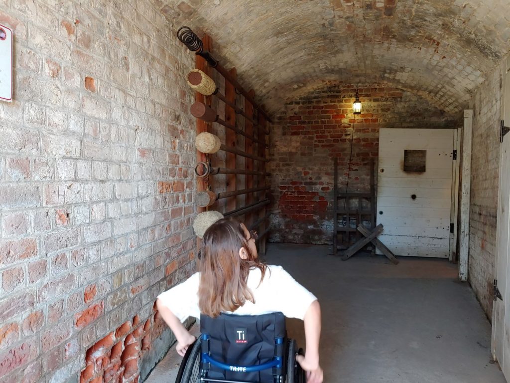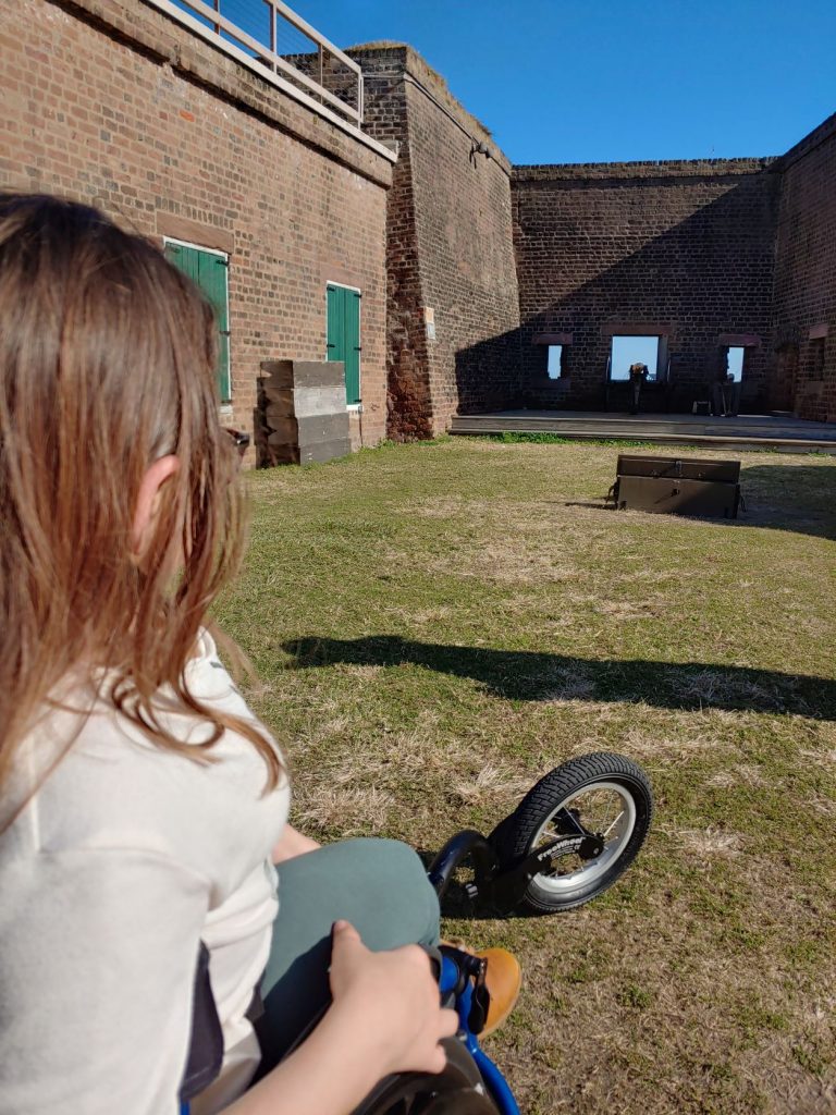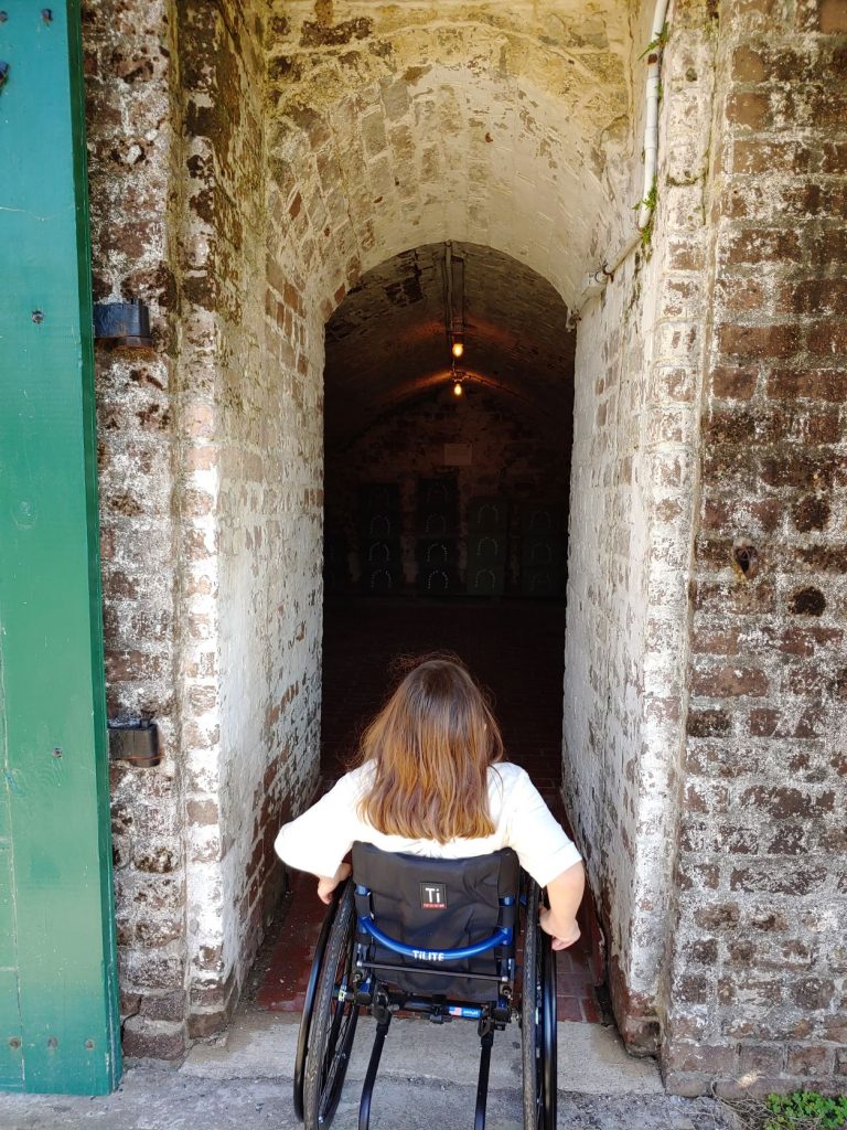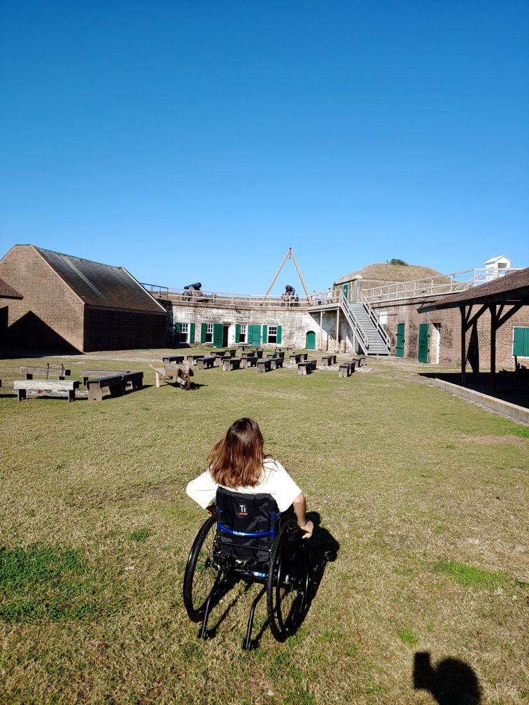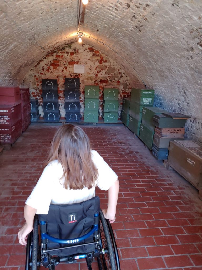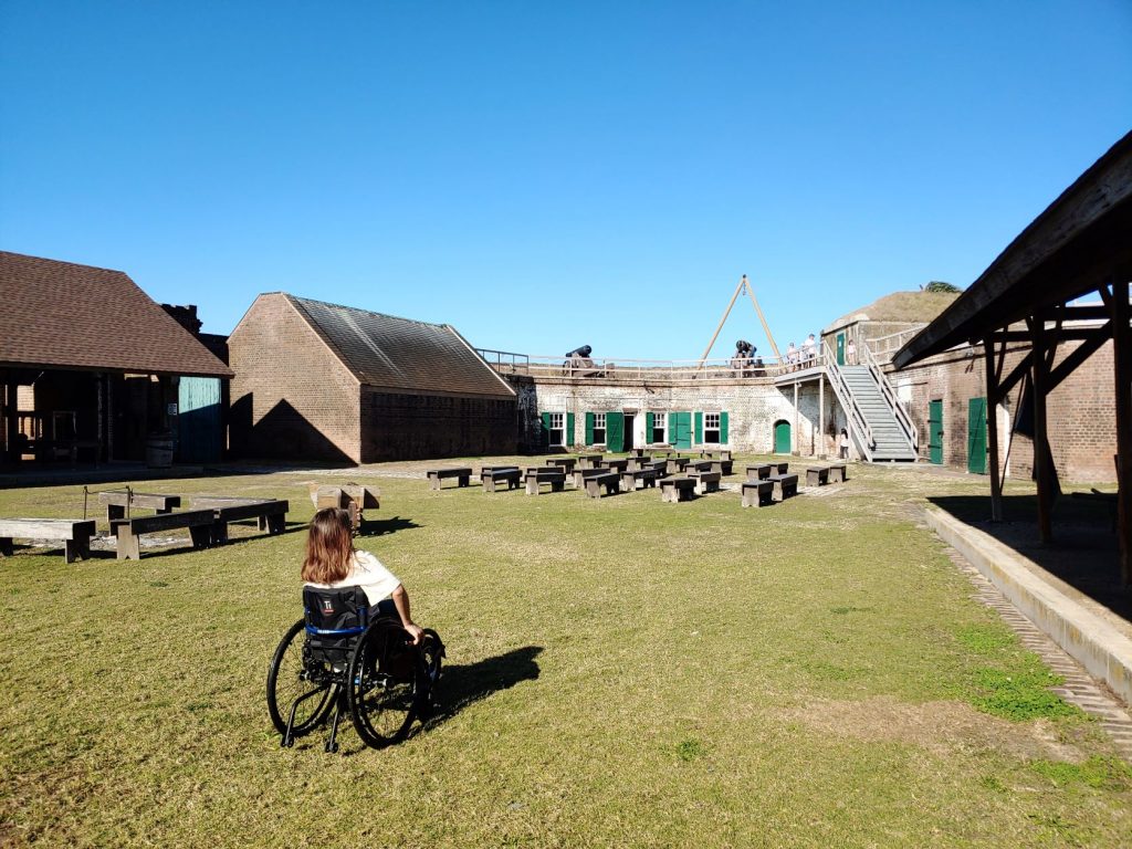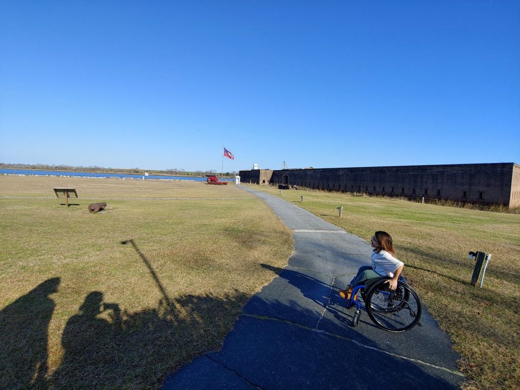 For an old fort, we were happy with how accessible Old Fort Jackson was. I used my freewheel and was able to navigate the large grassy areas, while the interior parts of the fort were easy enough to handle with my regular wheels. The only tricky part was parking, as most visitors go through the tiny Visitor Center. While the center has a steep wooden ramp on the front, the exit and path that follow are not designed for mobility. Instead, those who need to, are instructed to drive down to the end of the parking lot and cross to the fort along an access road. For a historic site, we were happy with what I could explore. There were only two parts I couldn’t access, the upper bunker level walkway and one demonstration area that has benches too close together to navigate between. I highly suggest asking lots of questions, the guide who was there for us knew so much about the history of the fort. There was a lot to learn!