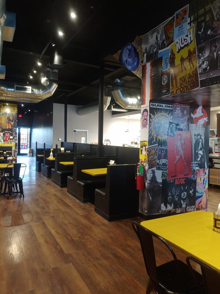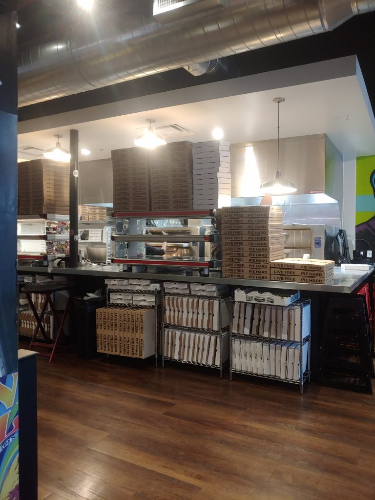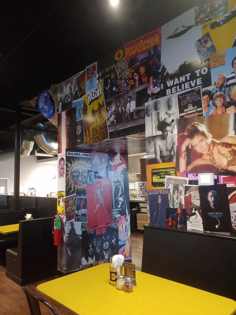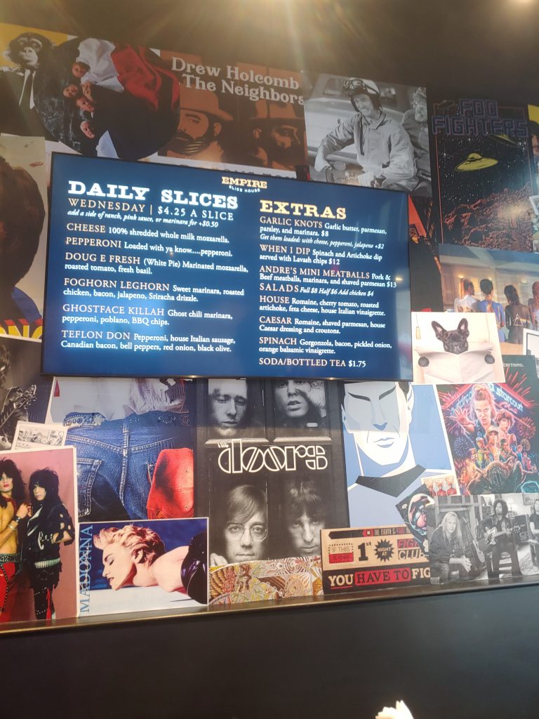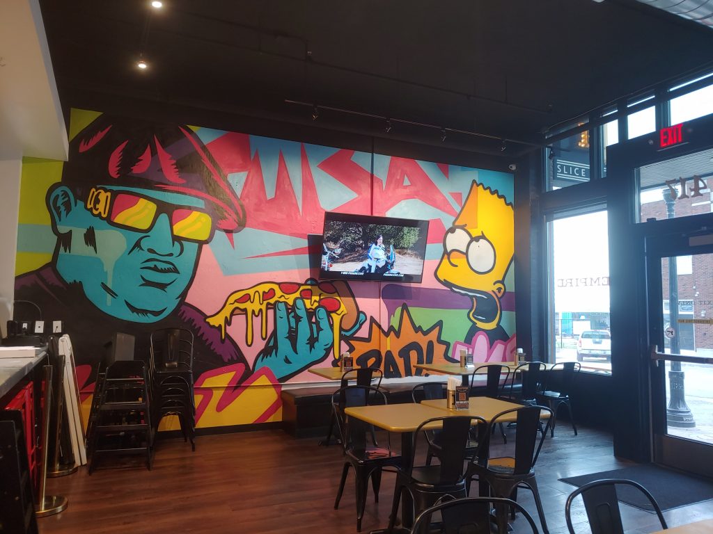 We just grabbed our slices to go, but Empire Slice would make a fun place to dine in as well. The walls are covered with graffiti-style murals and plastered with retro posters. They have a number of regular-height tables with chairs, and a row of booths as well, with plenty of room to roll in between.