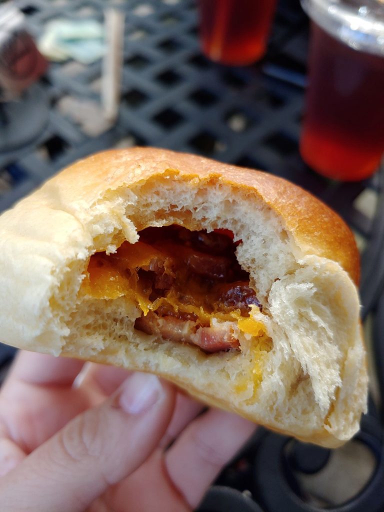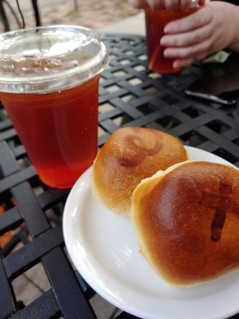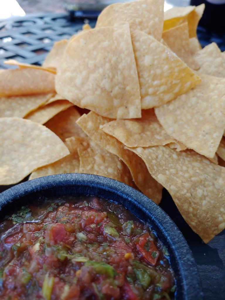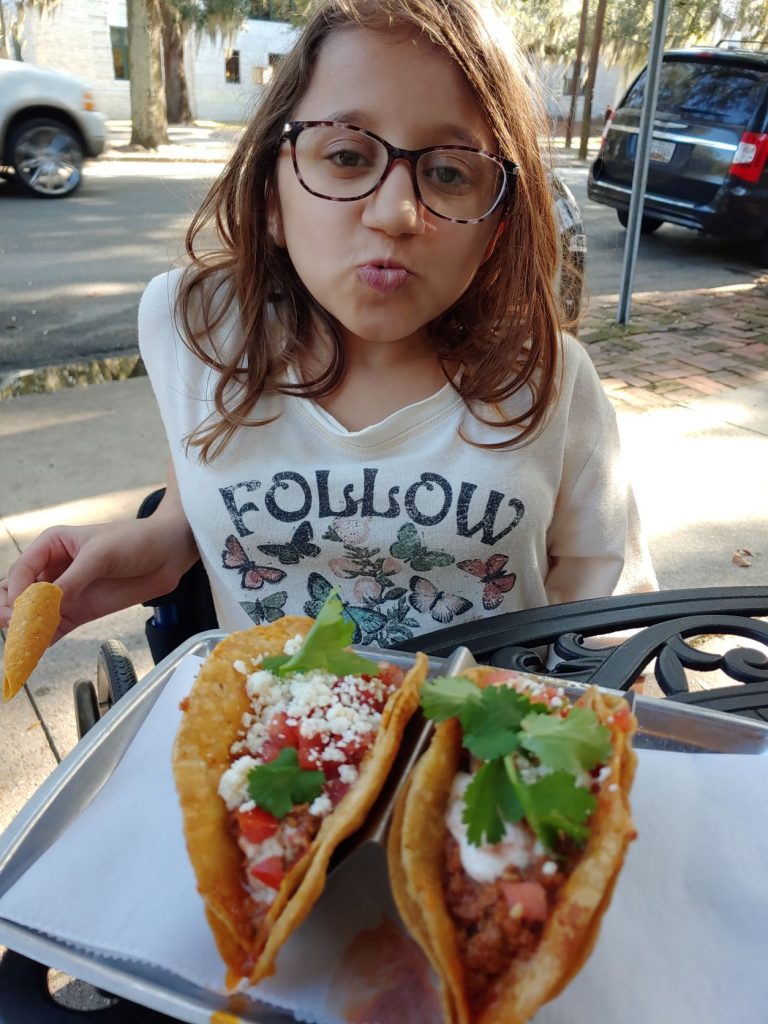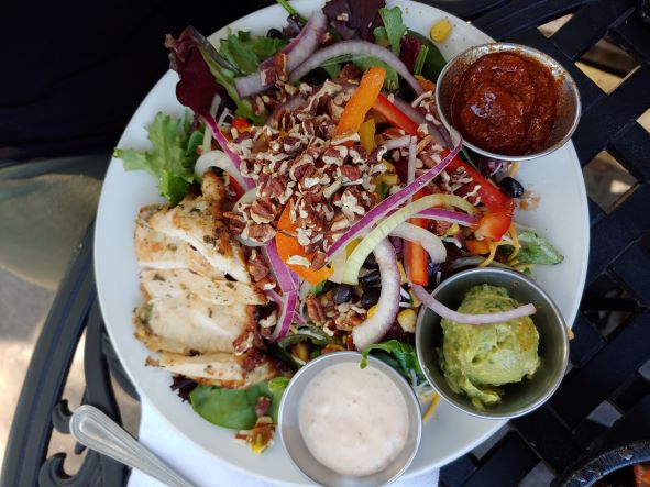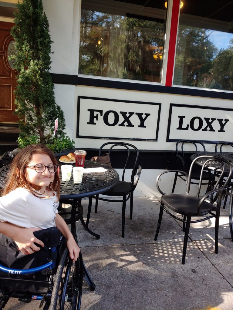Lunch yesterday was at Foxy Loxy Cafe. What can I say? Yummy food, coffee drinks, and a ramp to get in??? This girl is hooked. We tried their kolaches, which are a slightly sweet dough filled with yummy goodness, like sharp cheddar cheese and bacon! We also got their chips and dips combo, which includes a sampling of their “dips” menu. Everything was good and fresh, and their staff was great.