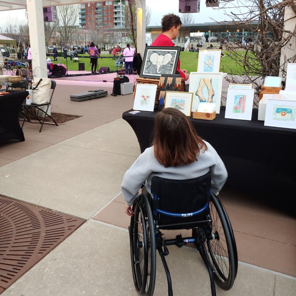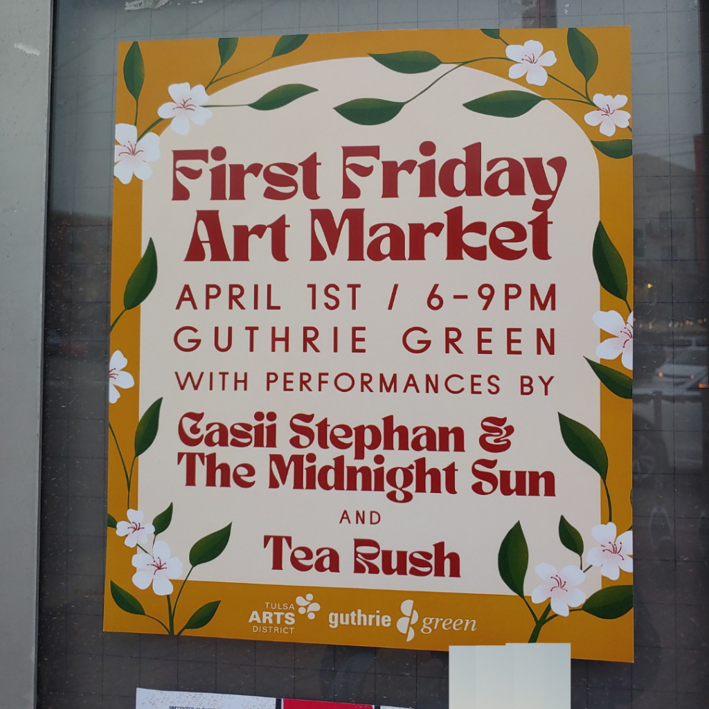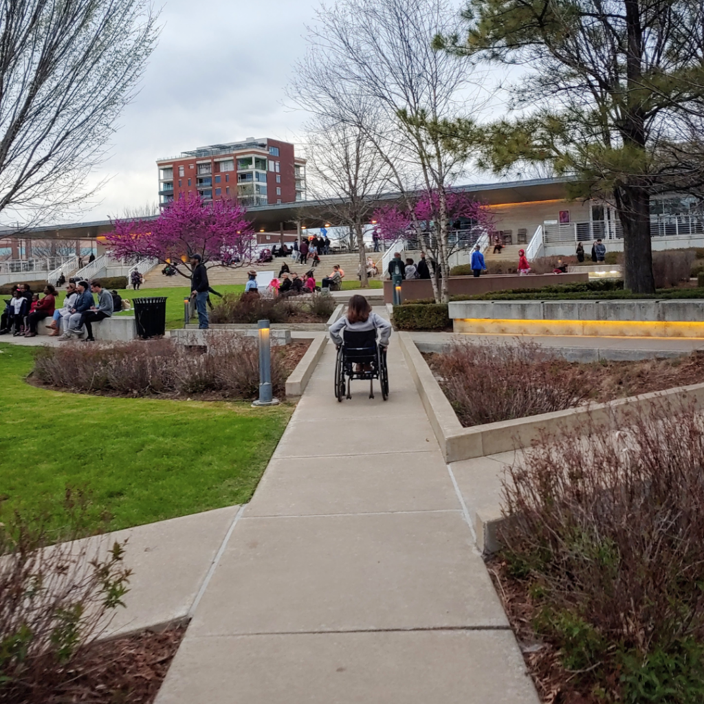 The space is constructed to be inclusive and those using wheelchairs should have no obstacles. The surrounding streets have sidewalks and nice curb cuts at each intersection. There is a lot to see and I particularly enjoyed visiting 108 Contemporary’s current exhibition. If the weather is nice and you are in Tulsa, you won’t want to miss First Friday at Guthrie Green.
