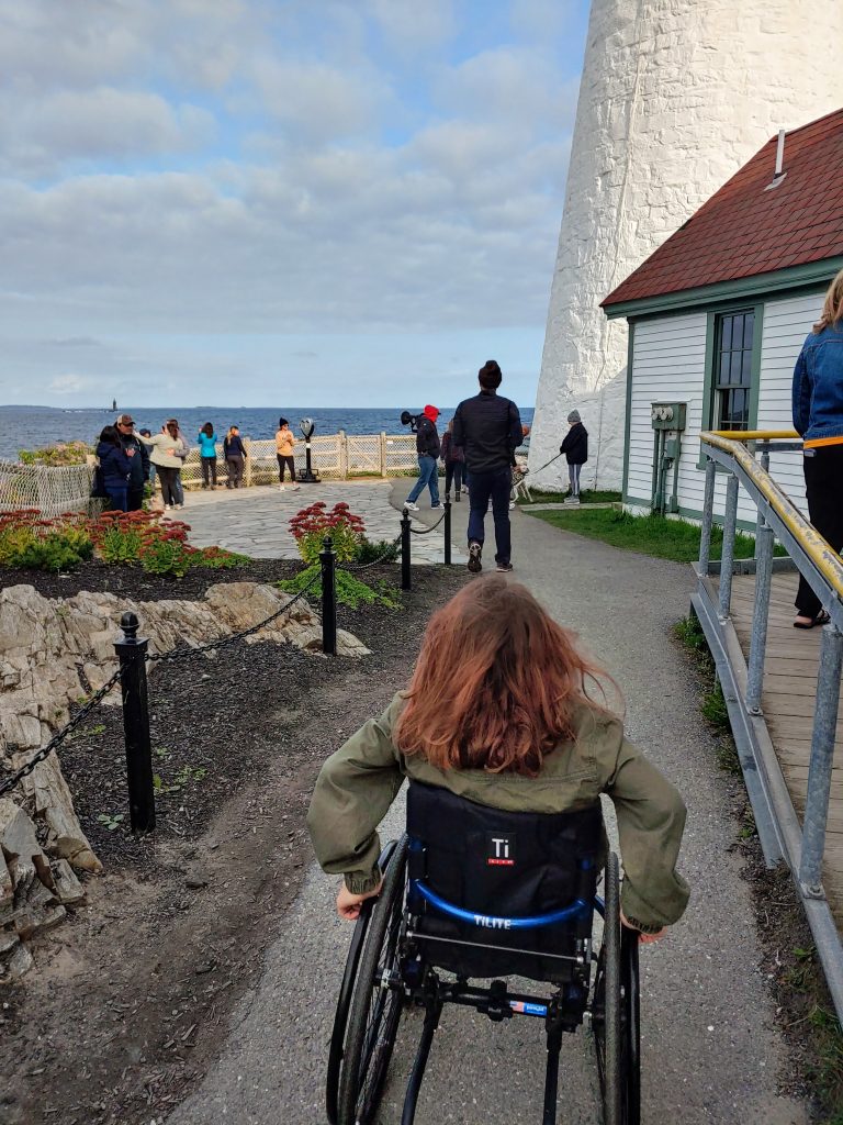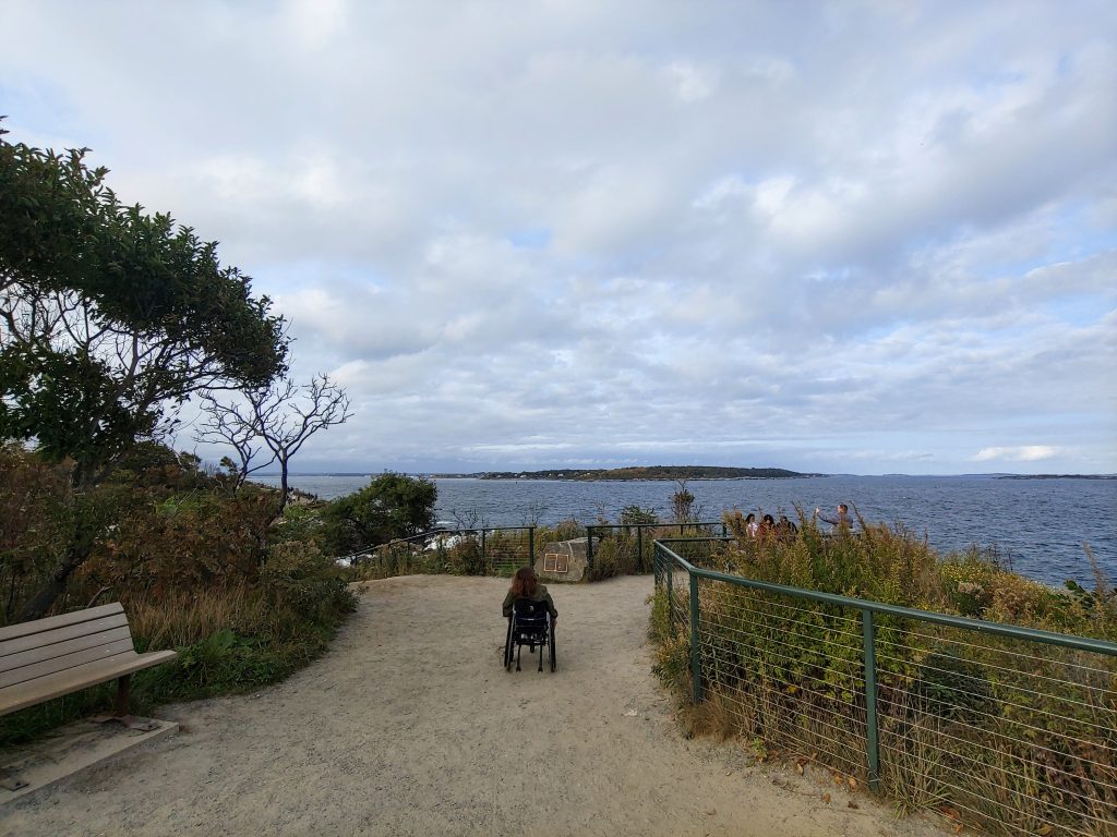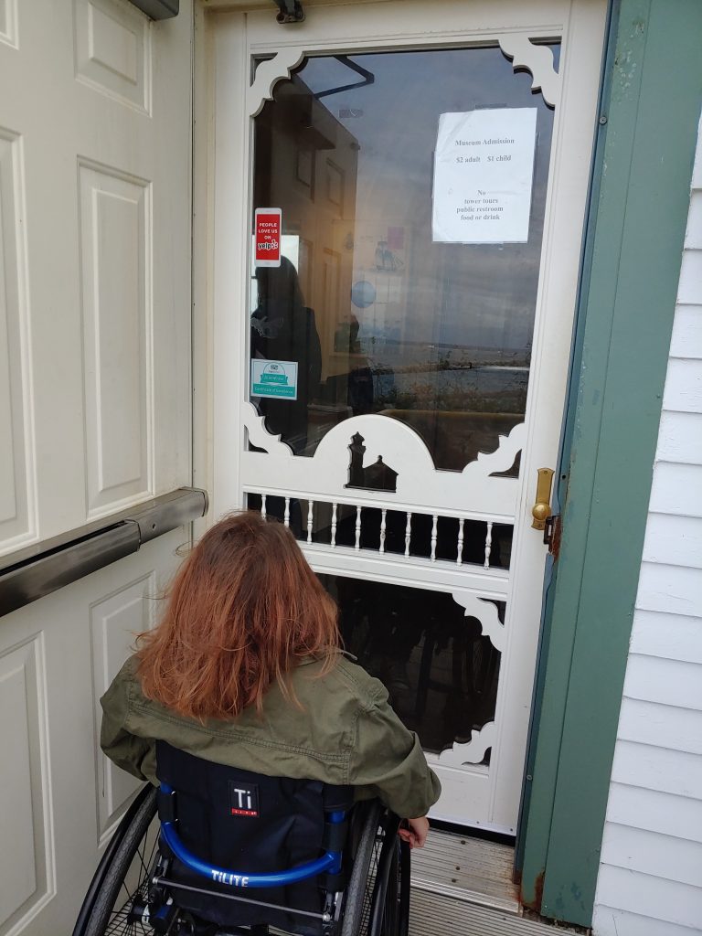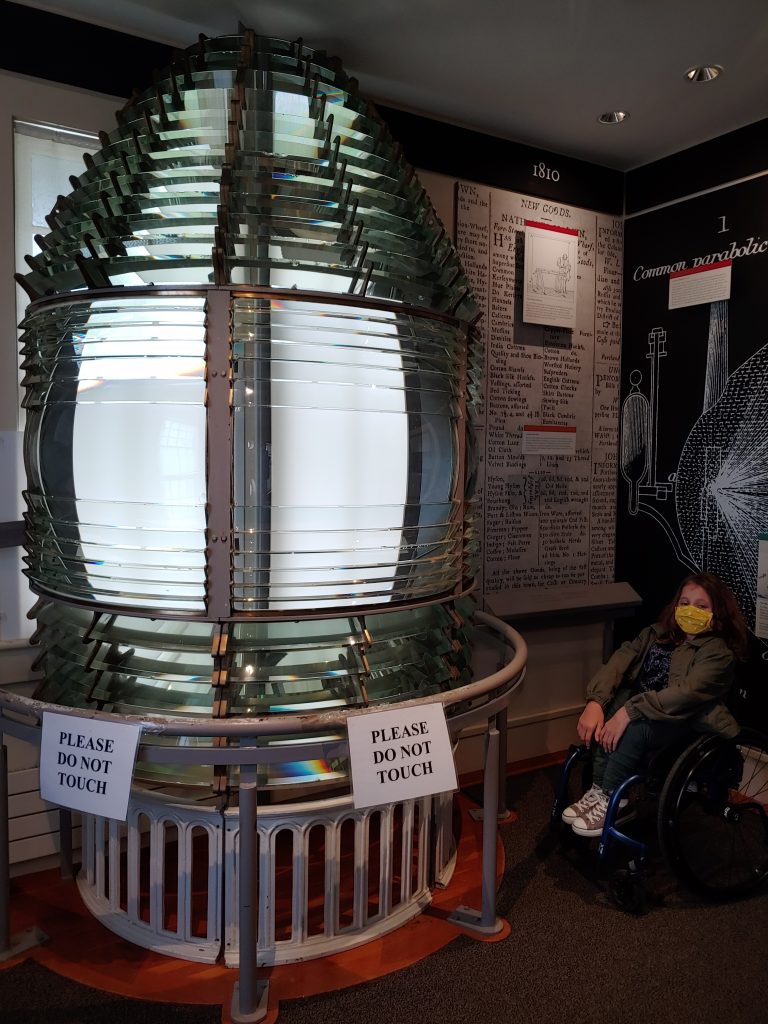 The museum was fully accessible and I had no problem rolling around and checking out the exhibits. Rolling around outside, the walkways to the museum and primary lighthouse viewing area are all paved so we had no trouble. For the other paths, which were hard-packed dirt, we used my Freewheel attachment. There were some inclines that I needed help with, but there was still plenty to see at this site even if you don’t have a traveling buddy to help.