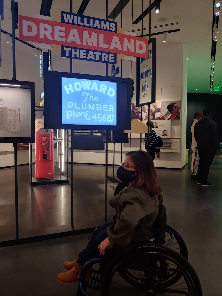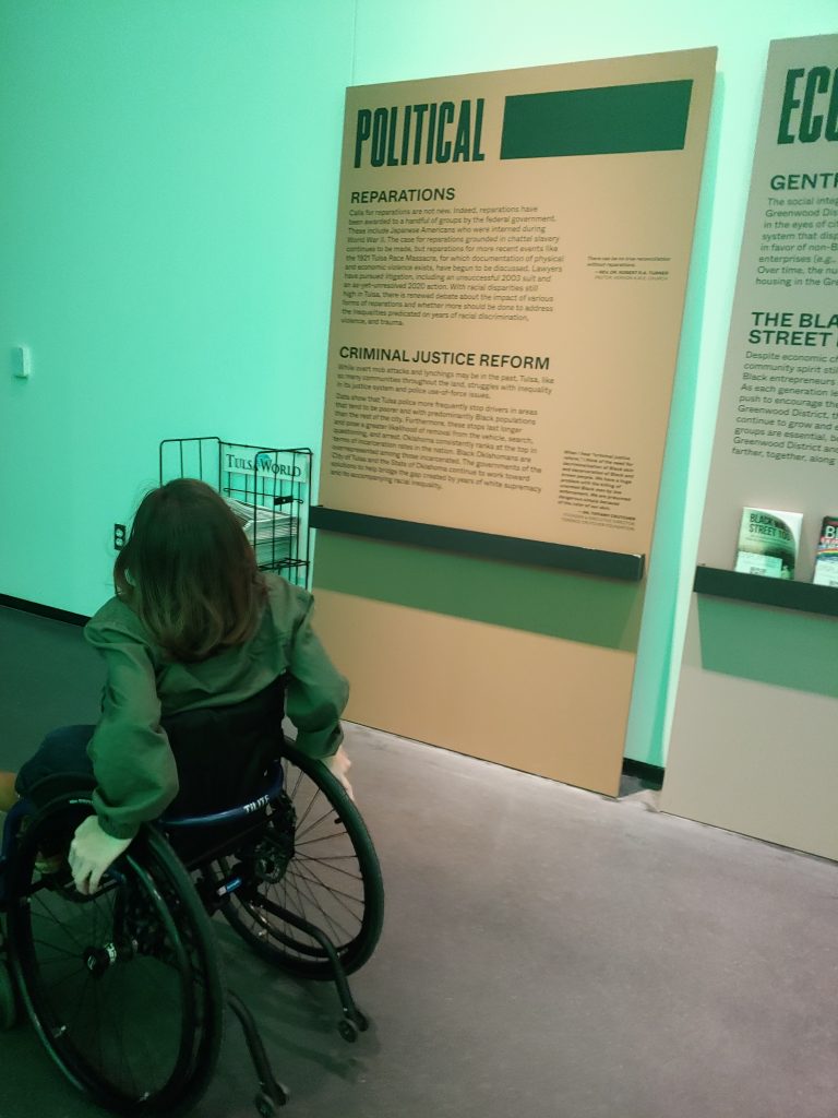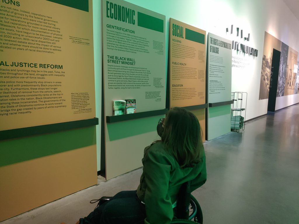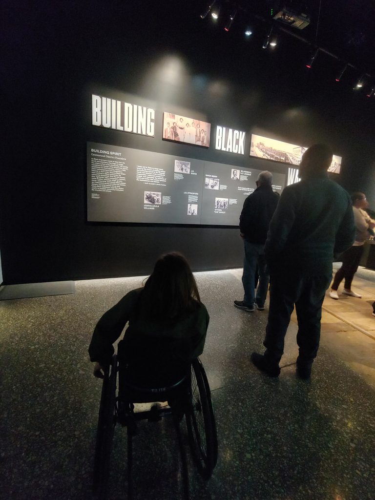 Every part of Greenwood Rising was accessible to me in my chair. Even the displays were at levels that allowed me to see the artifacts and read the history. On our first visit, we spent about 2 hours exploring, but I definitely felt like I needed more time to reflect on what I was seeing and to visit again. This is easy to do right now because tickets are free, but you do still need to reserve your spots online so they can maintain the intimacy of smaller crowds.