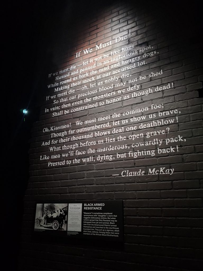 Greenwood Rising tells the remarkable and resilient story of the Greenwood community by bringing the story of Tulsa’s Black Wall Street to life. On the outside wall is a quote from James Baldwin that says, “Not everything that is faced can be changed, but nothing can be changed until it is faced.” I think museums like this are so important in making sure we don’t forget these big moments in history because otherwise, our world can never get better.