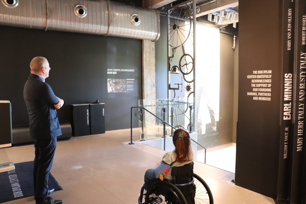 It is easy to find the Bob Dylan Center in the Tulsa Arts District. It is right next to the Woody Guthrie museum and has a huge mural across the front side of the building. Metered street parking is available with placard spots or several parking lots within a block. The museum was easy for all to enter, including those using wheelchairs. There was an elevator easy to spot just inside the front door to get you up to the main museum level. But before you start exploring, make sure to check out the metal sculpture in the lobby. It was made by Dylan himself special for the lobby of the center.