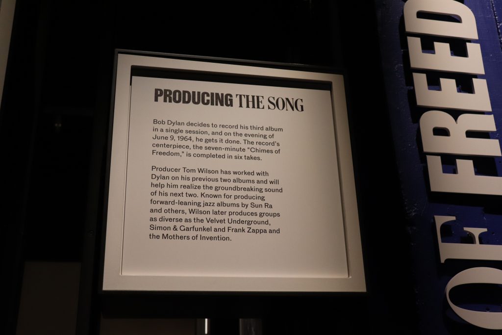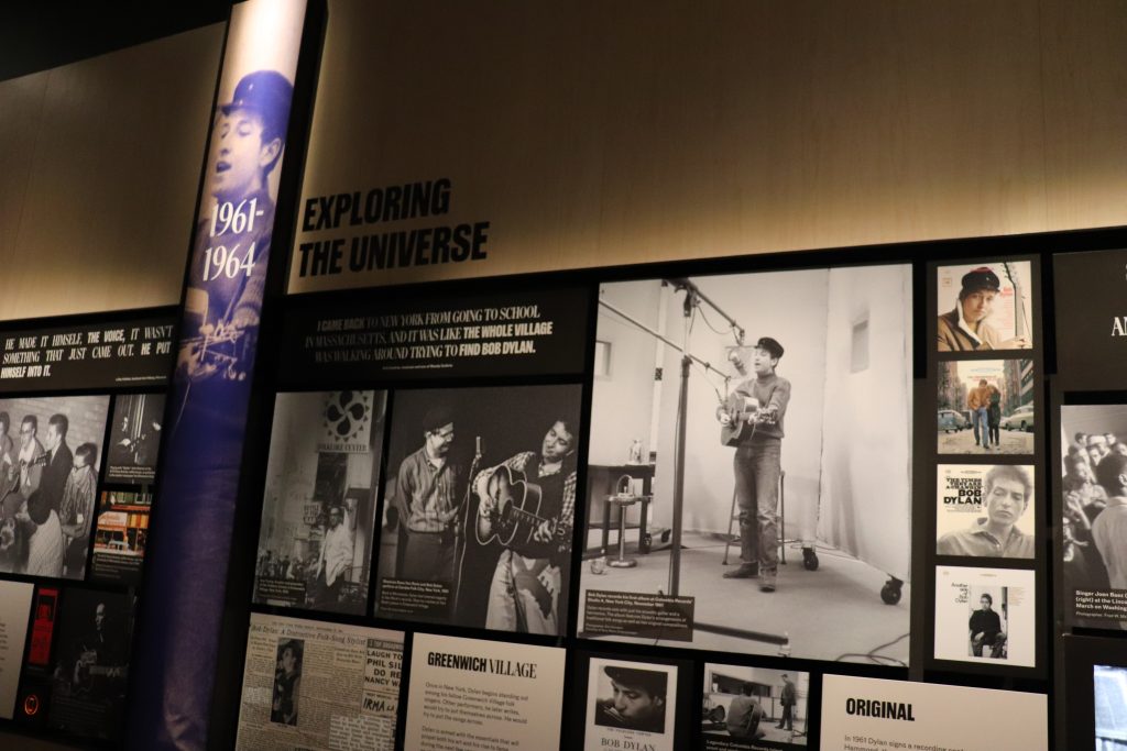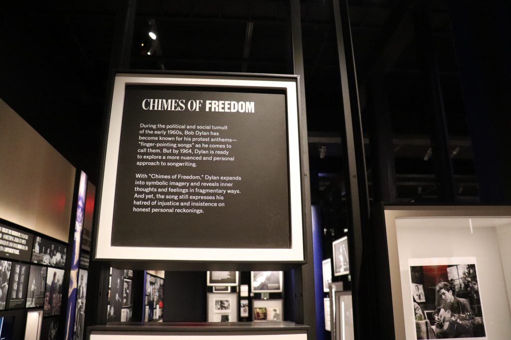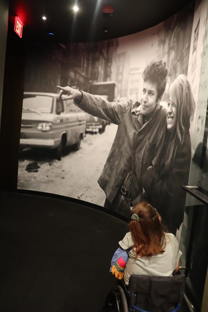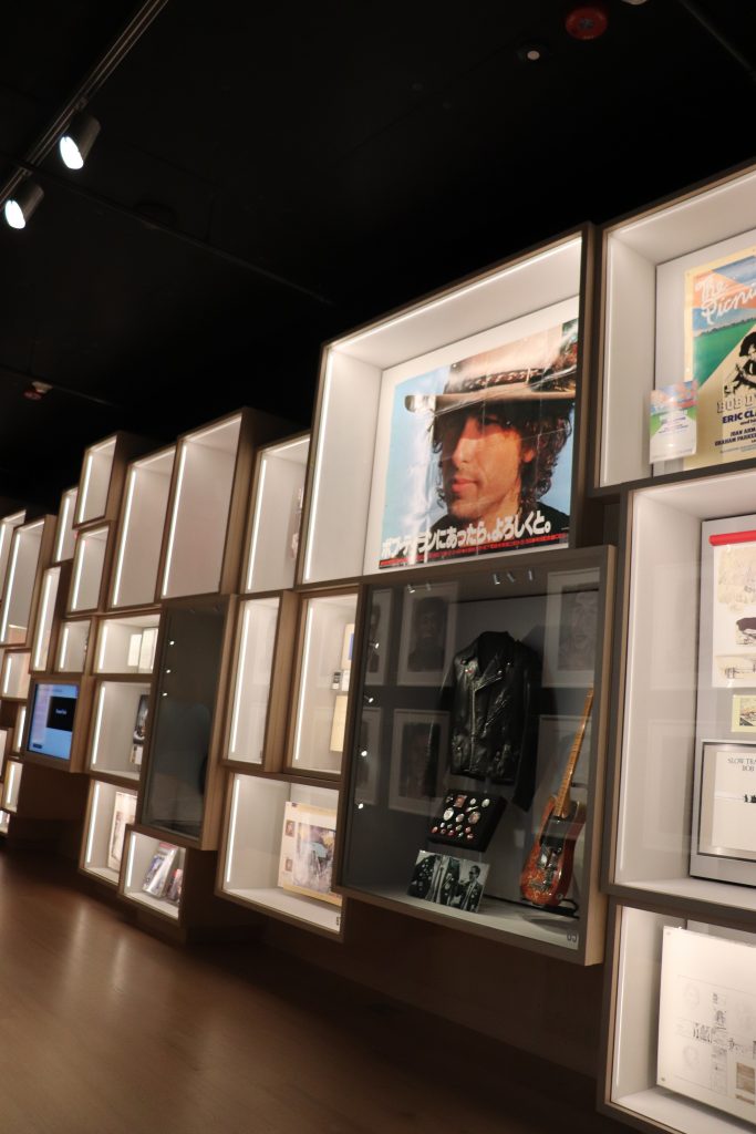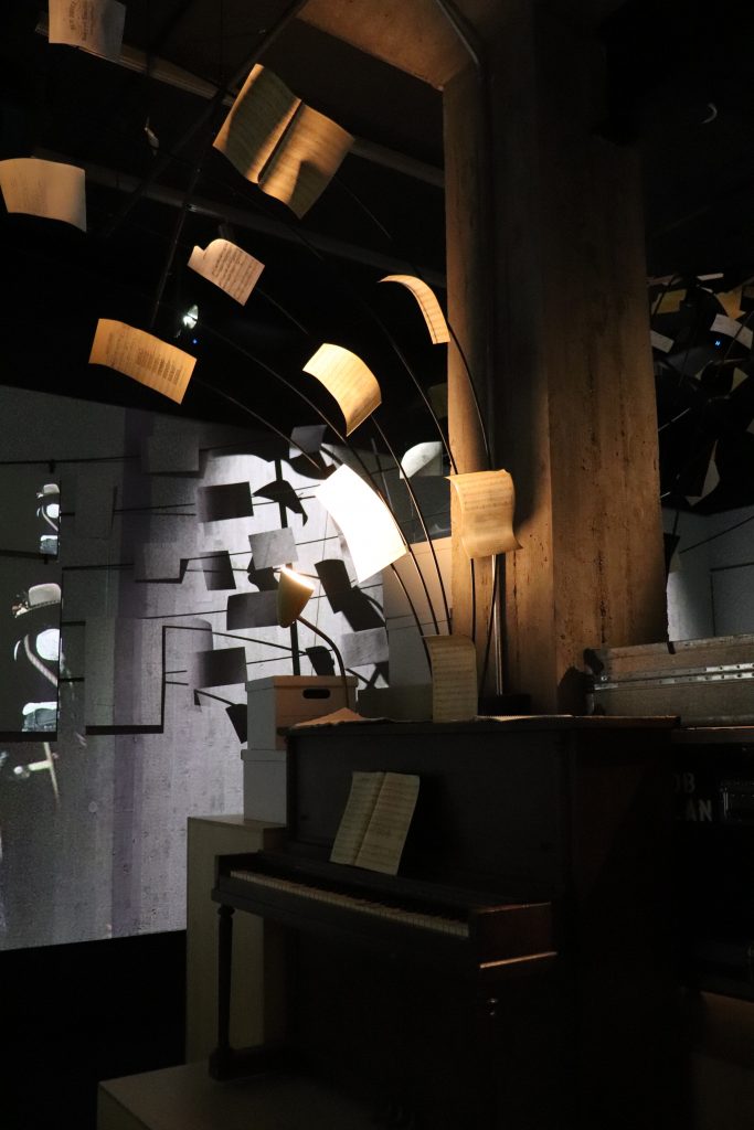 When you first enter, you find a large open space with screens all around displaying films and photos of Dylan’s life. Look over your head. There are lyric sheets that float through the air as if suspended by nothing all coming out of the piano in the center of the room, depicting how Dylan’s song poured out of the piano. The main exhibit area is broken down into eras of music and popular songs, with a giant timeline of his work stretching around the perimeter.