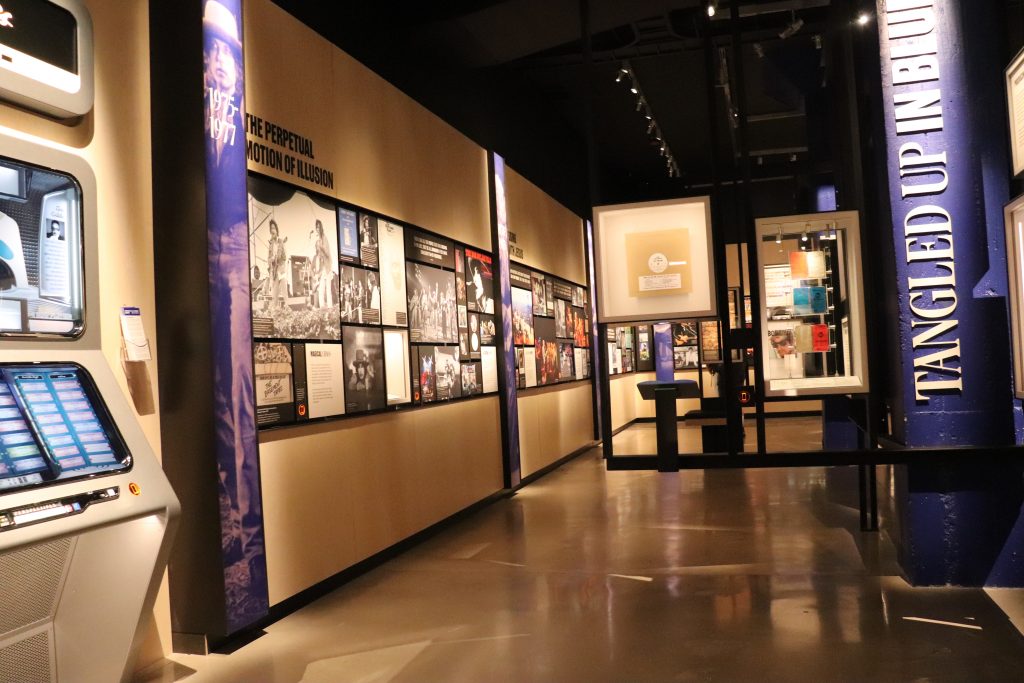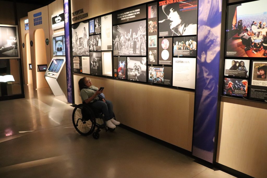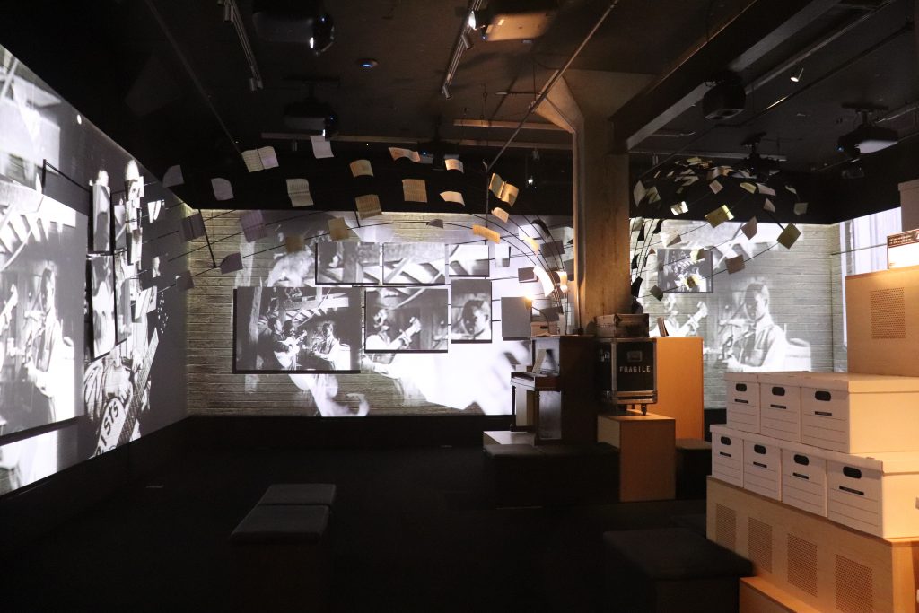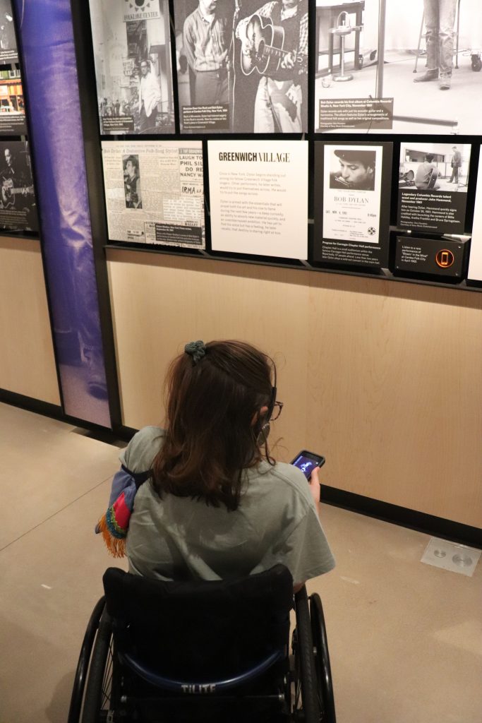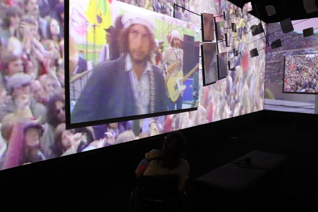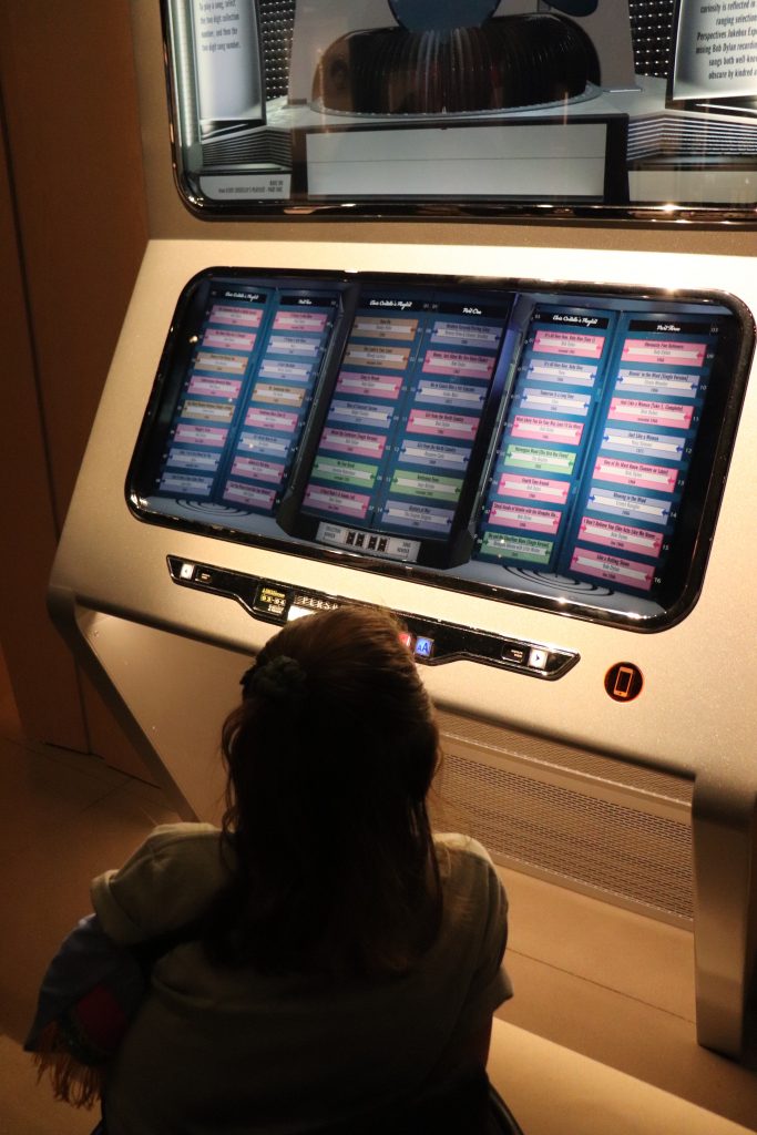 When you first enter, you find a large open space with screens all around displaying films and photos of Dylan’s life. Look over your head. There are lyric sheets that float through the air as if suspended by nothing all coming out of the piano in the center of the room, depicting how Dylan’s song poured out of the piano. The main exhibit area is broken down into eras of music and popular songs, with a giant timeline of his work stretching around the perimeter.