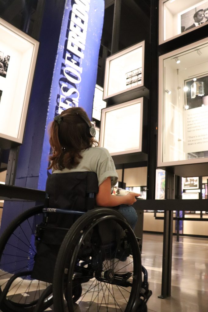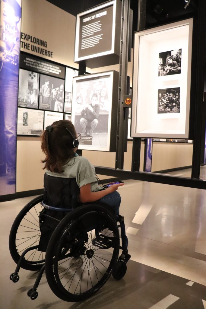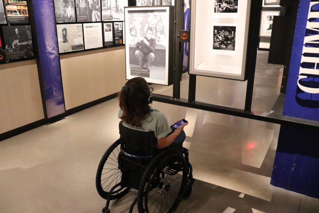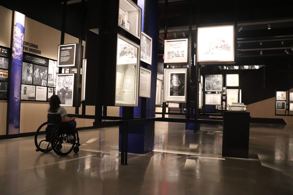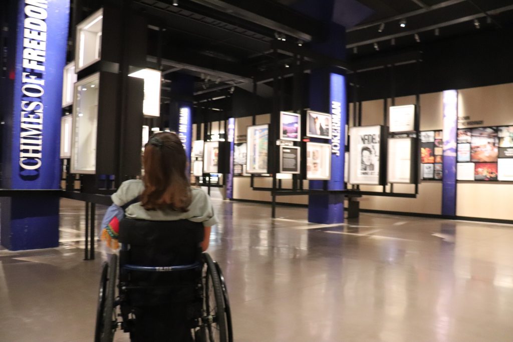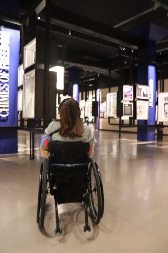 When you first enter, you find a large open space with screens all around displaying films and photos of Dylan’s life. Look over your head. There are lyric sheets that float through the air as if suspended by nothing all coming out of the piano in the center of the room, depicting how Dylan’s song poured out of the piano. The main exhibit area is broken down into eras of music and popular songs, with a giant timeline of his work stretching around the perimeter.