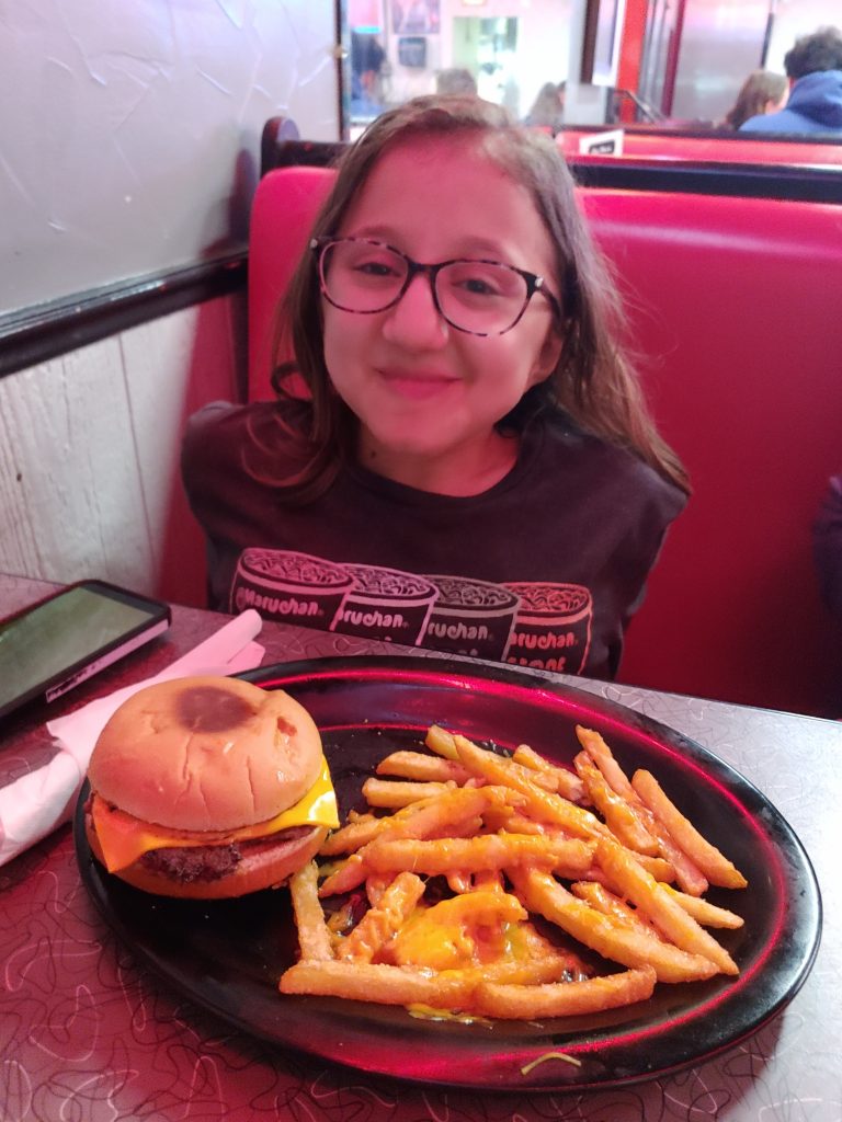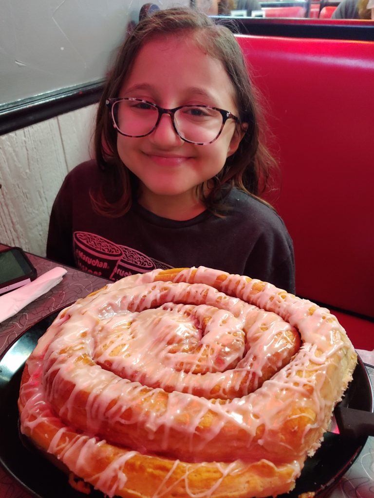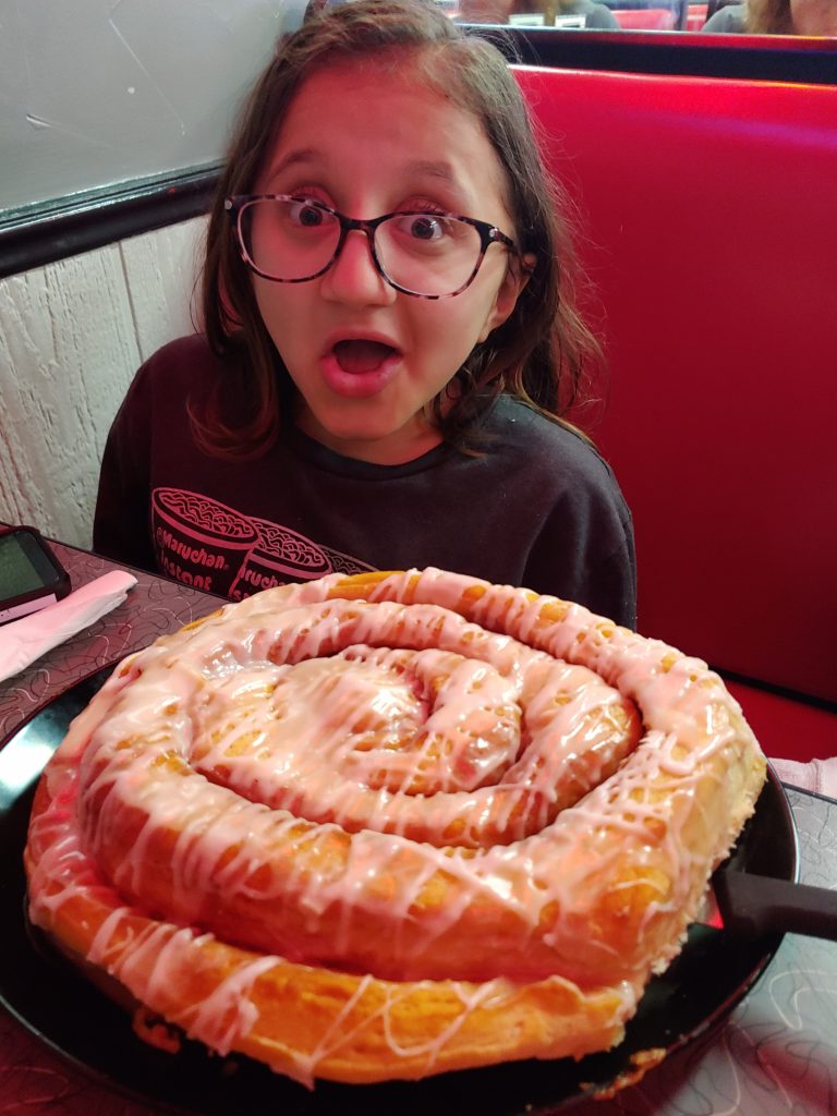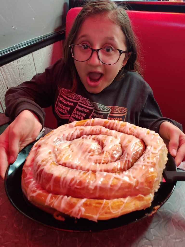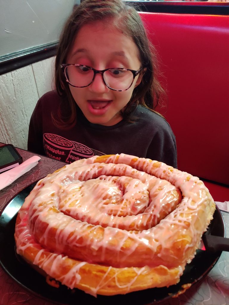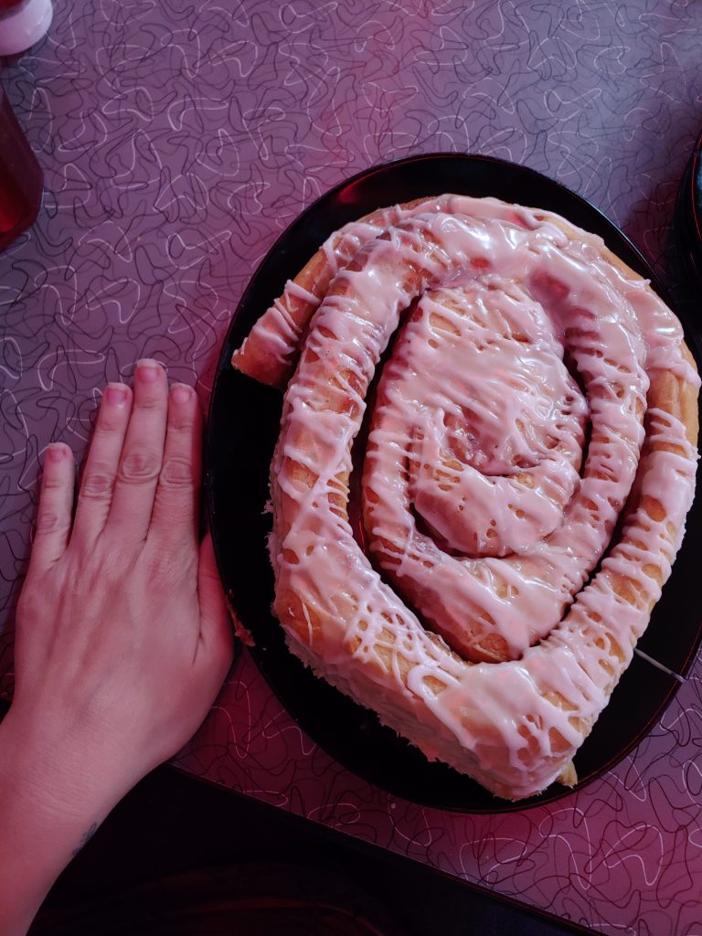 The cafe is wheelchair accessible and while we chose a window booth, there were tables if you need one. While it is not spacious inside, I was able to roll to a booth without a problem. I understand they can get crazy busy during breakfast hours, so you may need to wait for a space to open up. Street parking is available with a placard space right around the corner. There were signs directing you to backup parking areas. I loved their retro vibe with that fun feeling, and of course, that massive cinnamon roll.