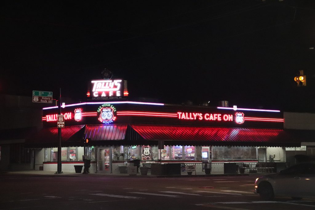 • Tally’s Cafe was right on historic Route 66 in Tulsa. They are a classic old-school diner. Open every day from 6AM to 10:45 at night. They serve breakfast all day, like any good diner should. They seem to be known for their country fried steak and fried chicken dinners, but I think probably best for all sorts of breakfasts and various burger, fries, onion ring combos. This location feels most family-friendly in the earlier daytime hours. That’s not much of a problem because these rolls sell out daily and you will want to get there before they do. We went right as it was just getting dark because we had been out taking photos of old Route 66 signs, and we got the last one! Whew!