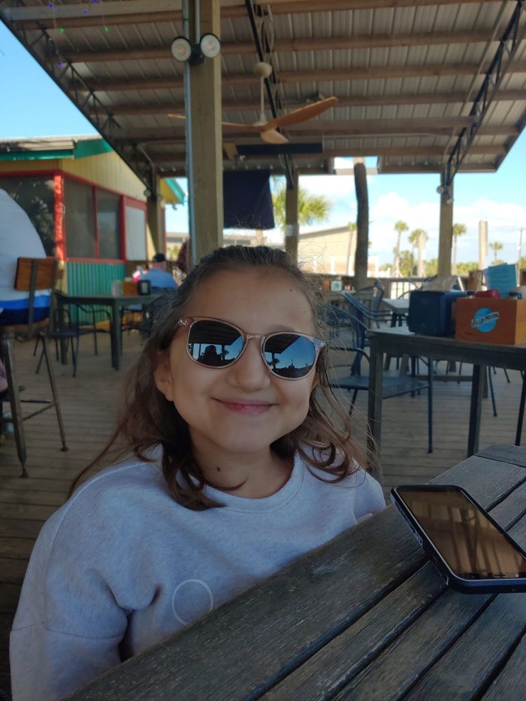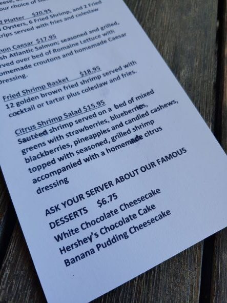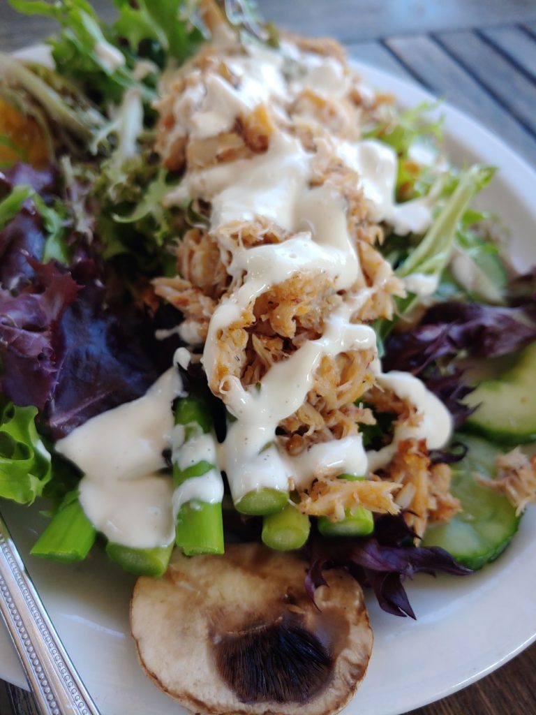 We were treated to fresh-picked crab and asparagus salad, fish bites, and fries that were so good we had to order a second basket. There was an easy ramp to get to the outdoor deck, and they are located just next to the very accessible public facilities. Win win.