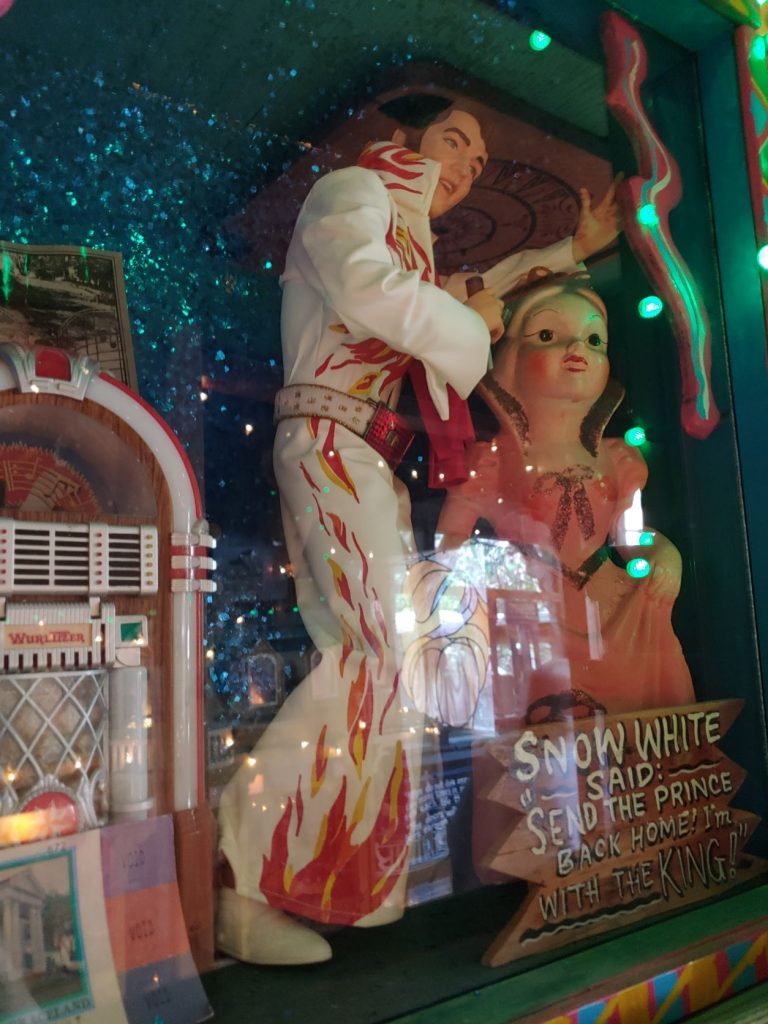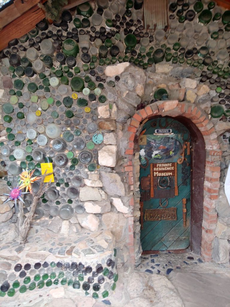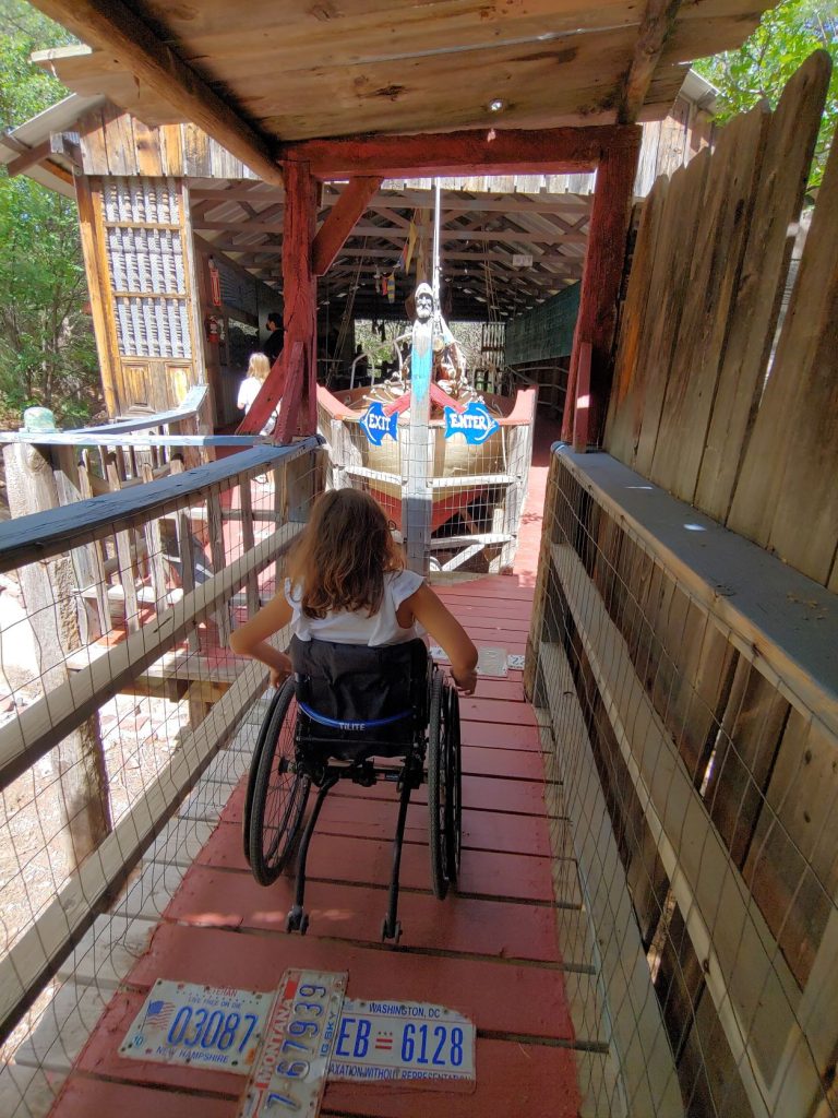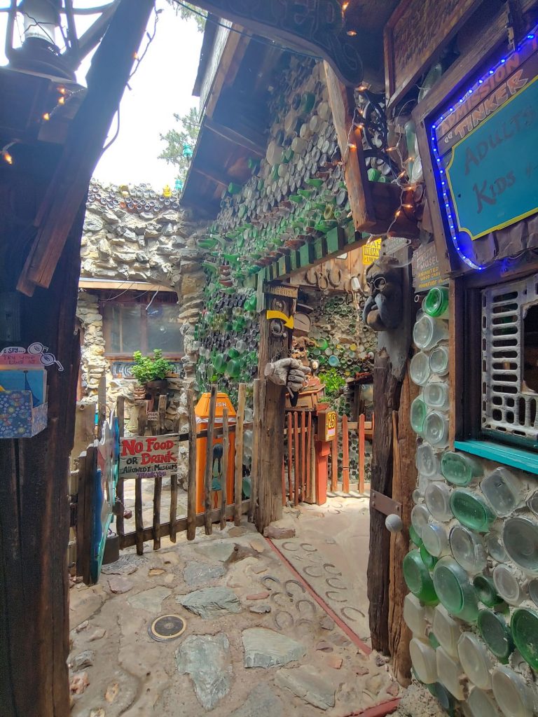 Now the nitty-gritty for people who use mobility aids like wheelchairs. This is going to be a tricky place to visit. The hallways are very thin and curvy. The floors are uneven, possibly even tilted. I use a smaller-than-standard-size manual wheelchair and with assistance from family, I was able to make this work. All of it. If you can transition to arm crutches or walk for short distances, that may be a better option. If you need a large or power wheelchair, the honest truth is that you may be better off limiting yourself to checking out the portions visible from the outside. There is a wall of fantasy storefronts that are interesting and completely outside the building. If you are traveling through this area with family or friends, you may just want to enjoy the mountain air and the outdoor displays. So is the Tinkertown Musuem accessible? I would say only if you have a friend or family member there to help and a slim manual chair.