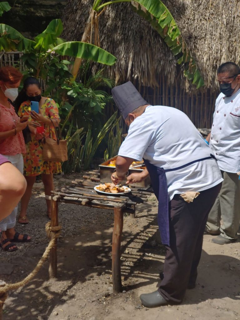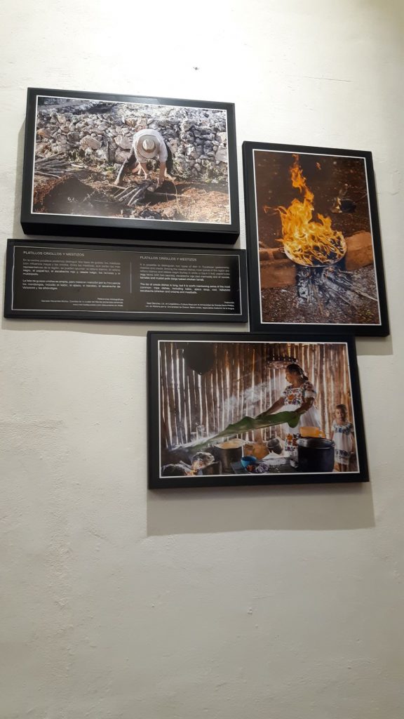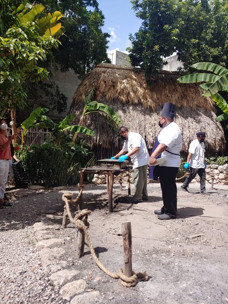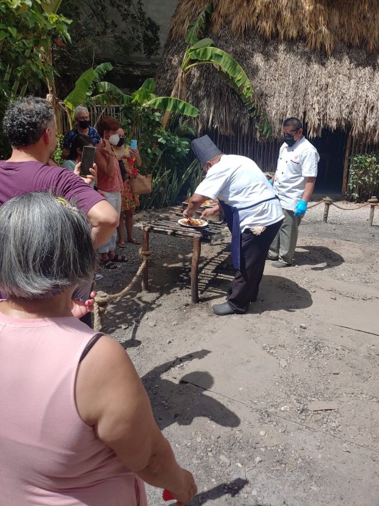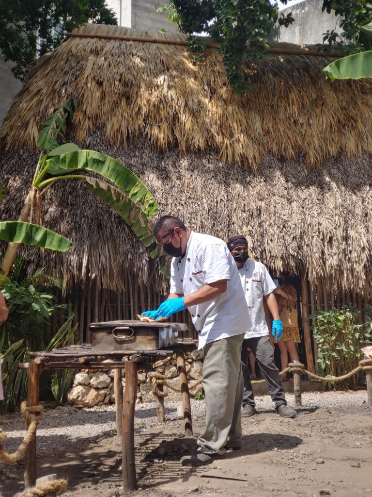 We had never been to a place quite like this and MUGY won our hearts. There is a small museum in rooms set to the right of the restaurant. Colorful signage and historical artifacts tell the history of Mayan cuisine. Do you like immersive experiences? So do I, and you can’t get any more immersive than gathering outside in their simulated Mayan puebla, watching classic dishes being prepared, and then watching the final steps of Conchinita Pibil. What if I told you it even included free samples of this specialty?