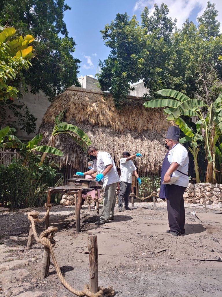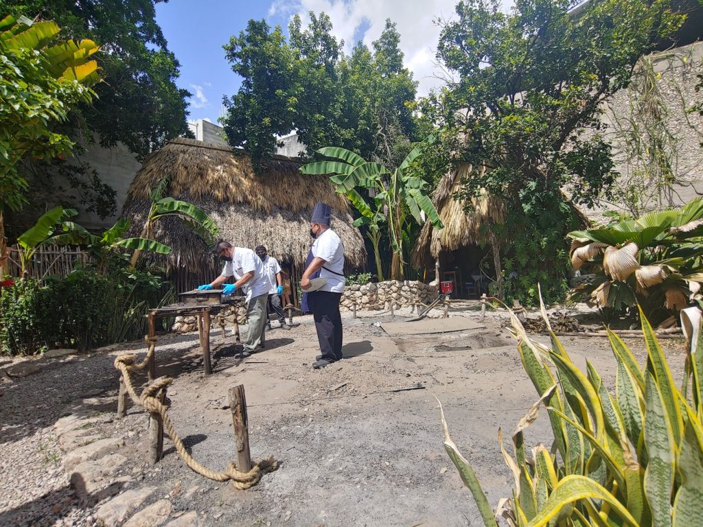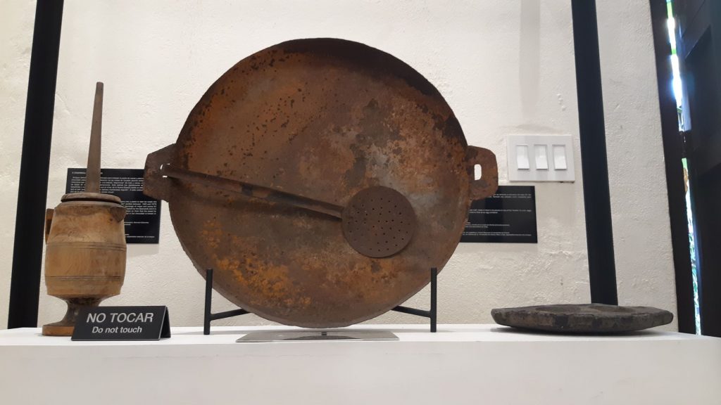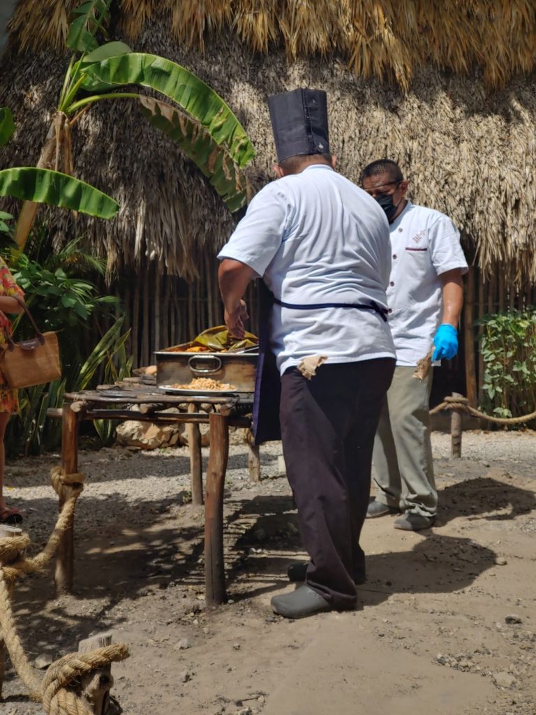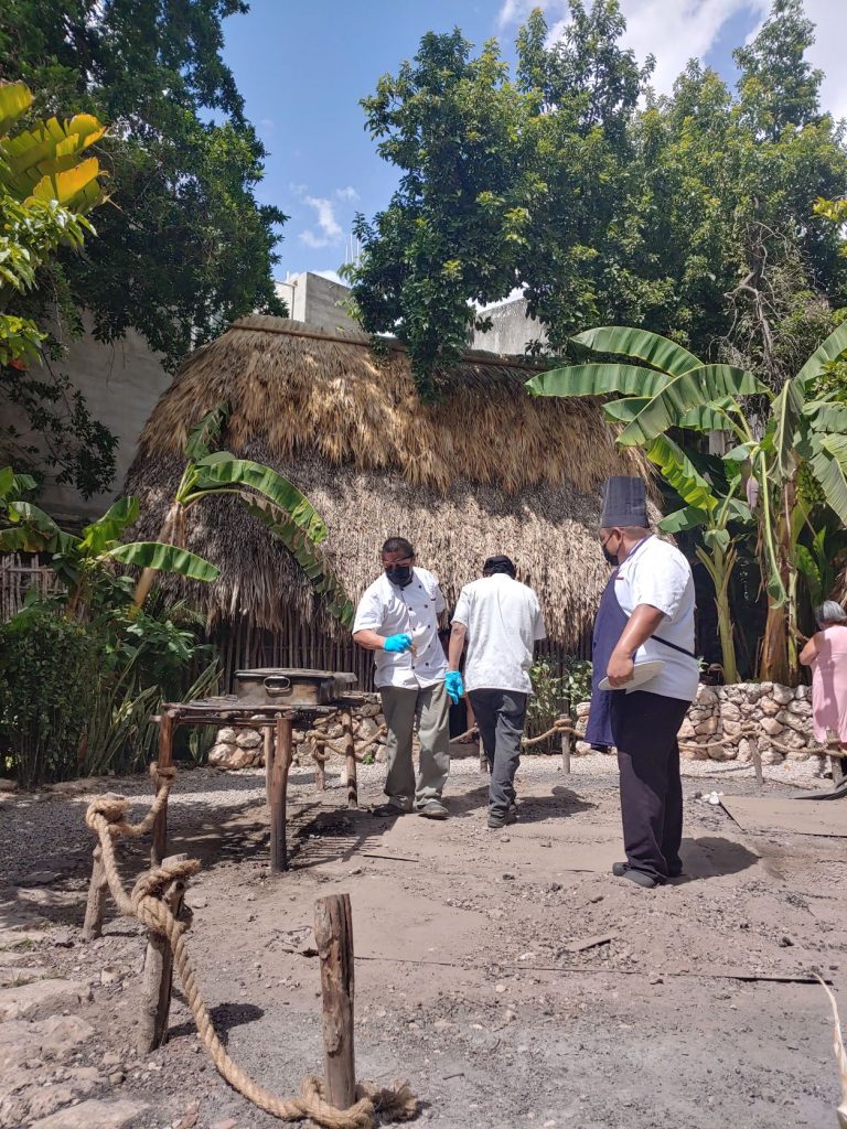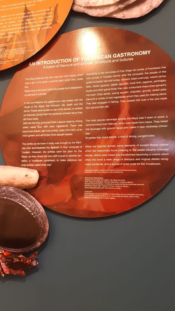 We had never been to a place quite like this and MUGY won our hearts. There is a small museum in rooms set to the right of the restaurant. Colorful signage and historical artifacts tell the history of Mayan cuisine. Do you like immersive experiences? So do I, and you can’t get any more immersive than gathering outside in their simulated Mayan puebla, watching classic dishes being prepared, and then watching the final steps of Conchinita Pibil. What if I told you it even included free samples of this specialty?