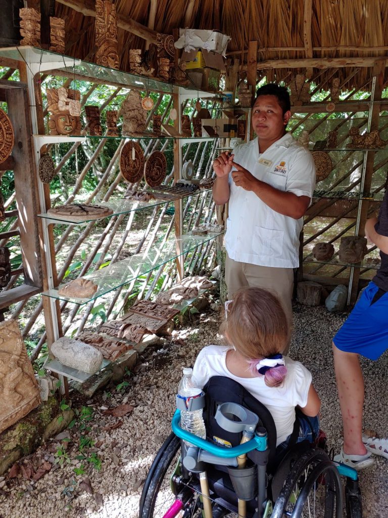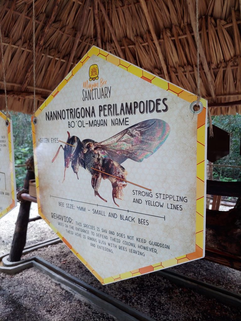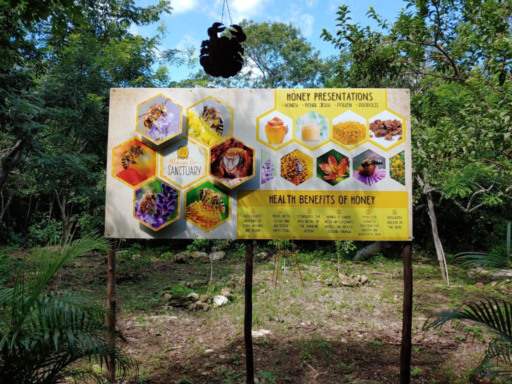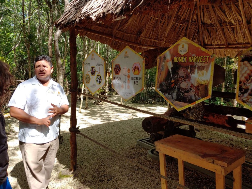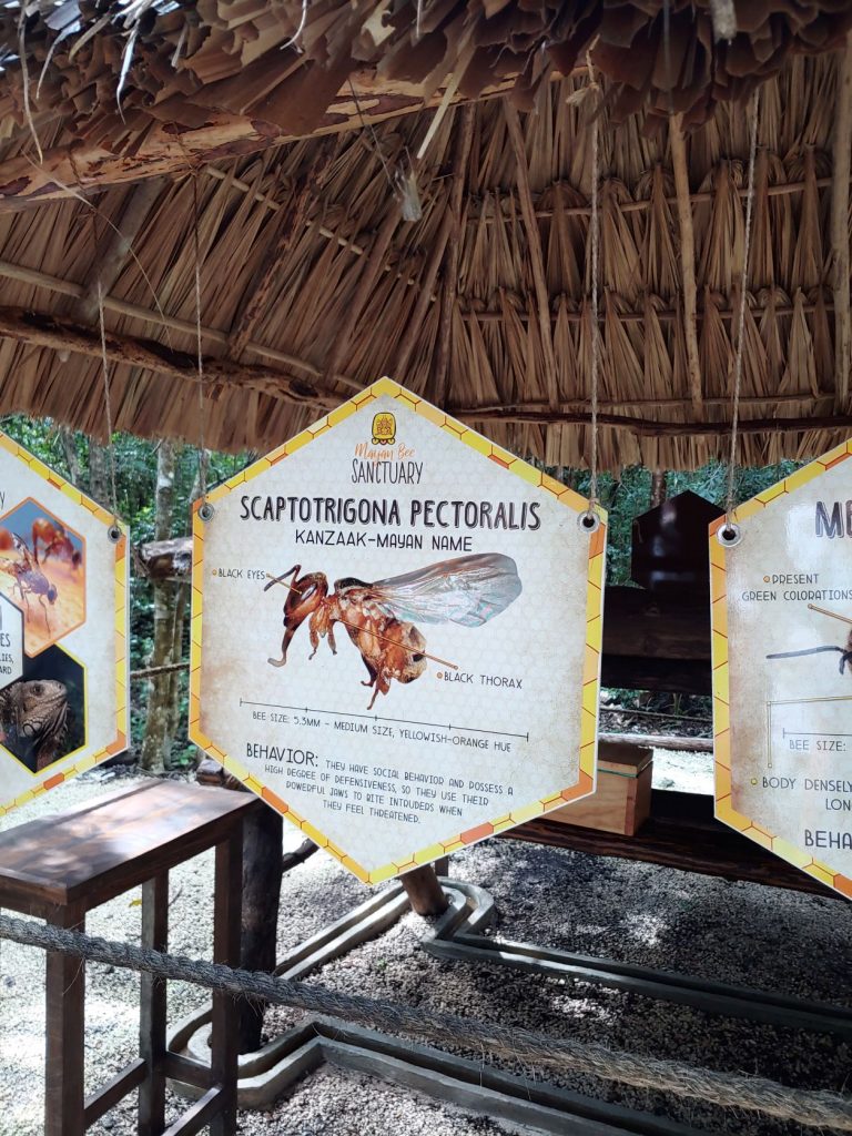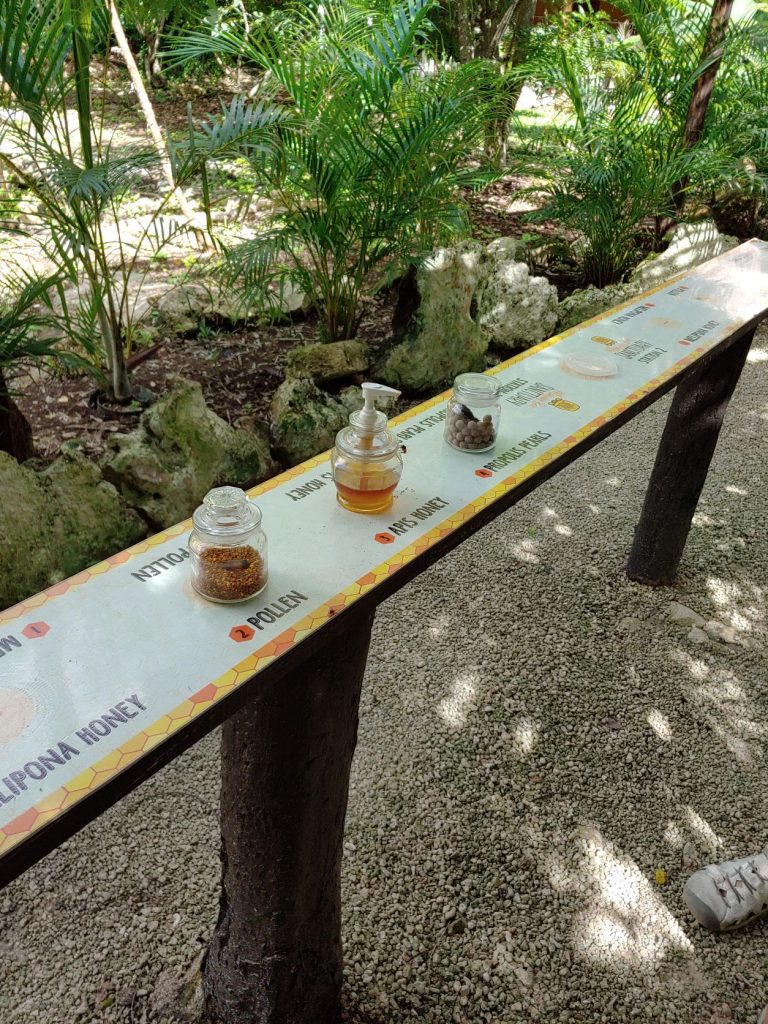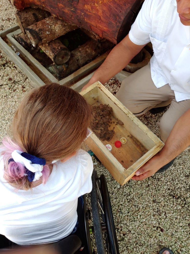 Visiting the stingless Melipona bees at the Mayan Bee Sanctuary was both an educational and a fun afternoon. Your admission ticket provides a guided tour through the grounds where graphic displays are set in nature along an unevenly packed gravel path. While NOT considered to be a wheelchair-accessible path, we are a determined family and made it work with my manual chair and extra pushing hands from friends. There was one portion of the path that had a step, but our guide was able to direct me to an alternate path and we don’t think I missed any features.