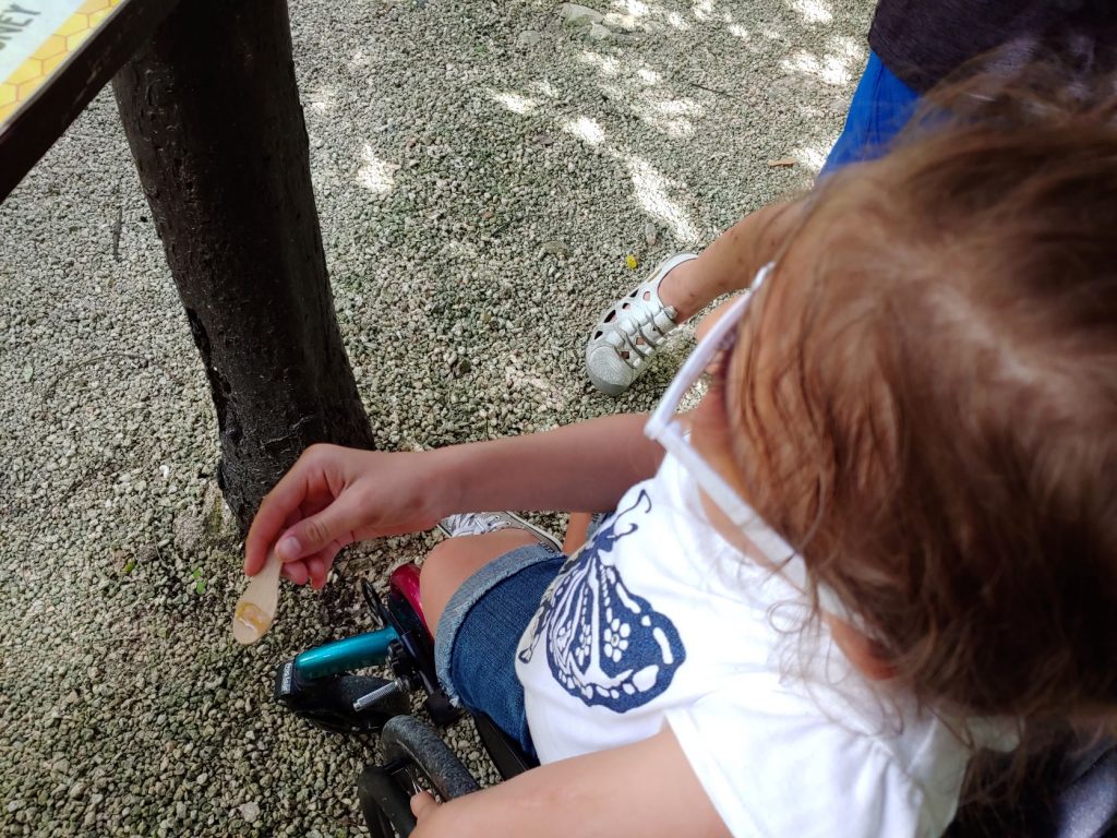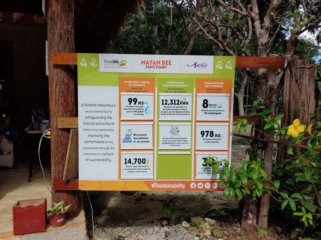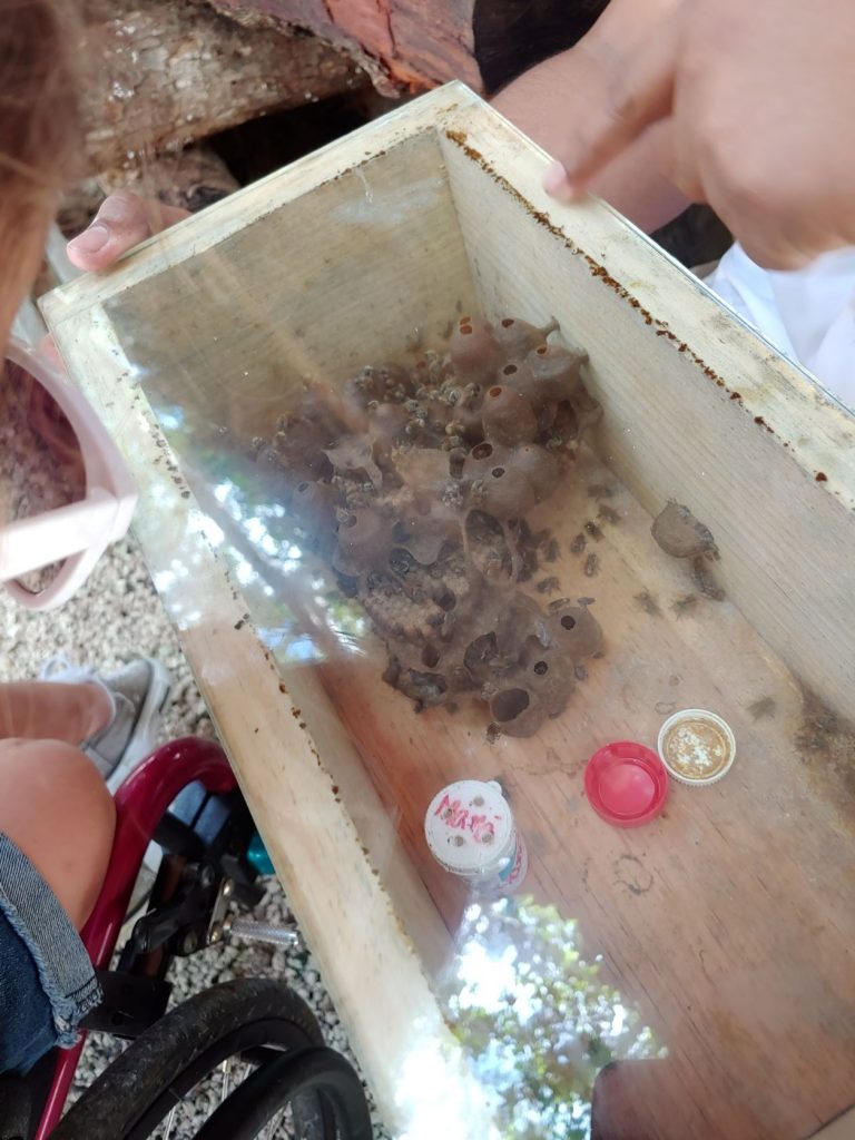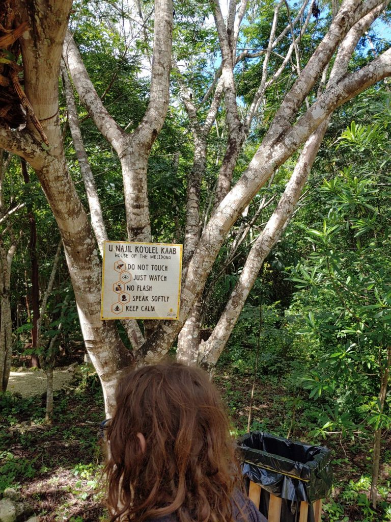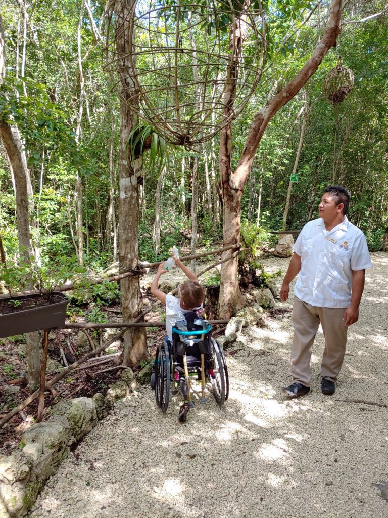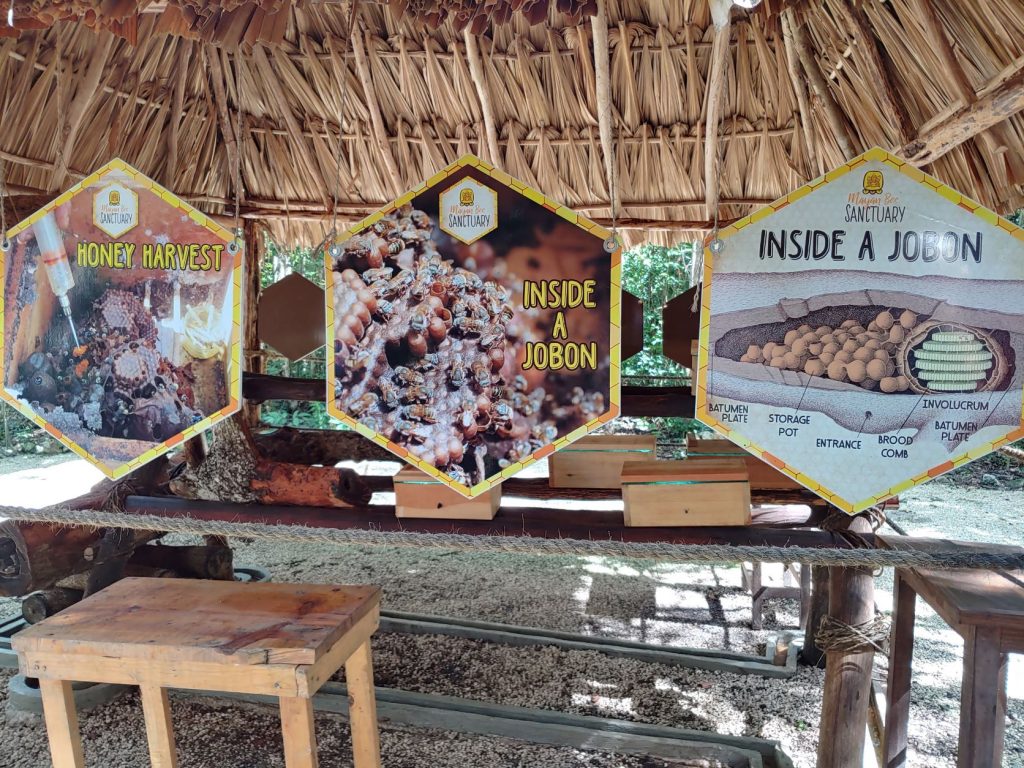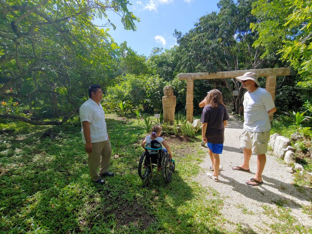 Visiting the stingless Melipona bees at the Mayan Bee Sanctuary was both an educational and a fun afternoon. Your admission ticket provides a guided tour through the grounds where graphic displays are set in nature along an unevenly packed gravel path. While NOT considered to be a wheelchair-accessible path, we are a determined family and made it work with my manual chair and extra pushing hands from friends. There was one portion of the path that had a step, but our guide was able to direct me to an alternate path and we don’t think I missed any features.