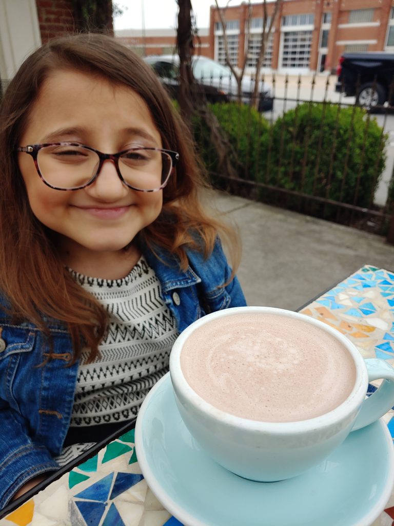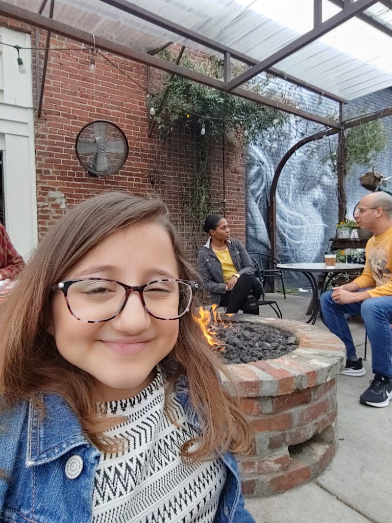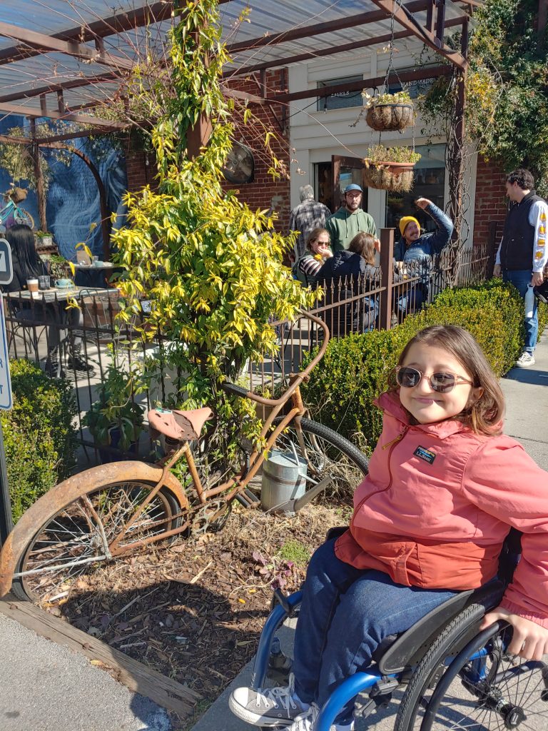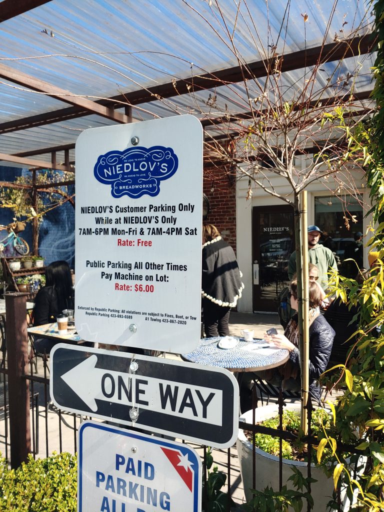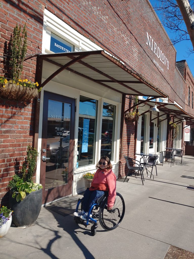 I really love how accessible they are, including their outdoor patio which has a large fire pit in the middle. They have a small, free parking lot for customers on the side of the building, with a dedicated placard spot! From there it’s easy and flat to roll right from the sidewalk, to inside, to counter, to tables inside, or out to the patio. A total win!